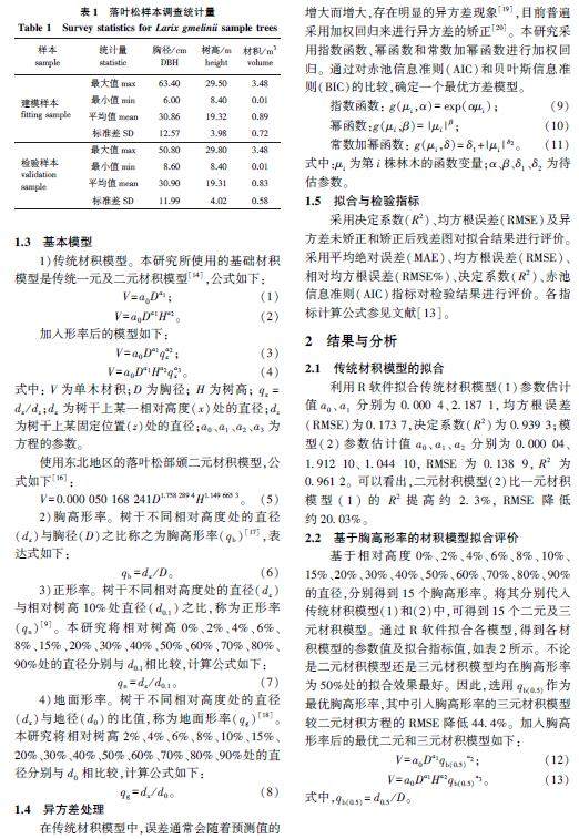 摘要:【目的】以大兴安岭落叶松为研究对象,基于胸高形率、正形率以及地面形率,分别构建含有不同形率的单木材积模型,并与传统的一元和二元材积模型以及东北地区落叶松部颁二元材积模型进行比较分析。【方法】基于落叶松实测数据,将树干不同高度处的一系列胸高形率、正形率和地面形率引入传统材积模型中,分别构建含有不同形率的二元和三元单木材积模型,引入方差函数消除模型拟合时产生的异方差现象。(剩余14295字)