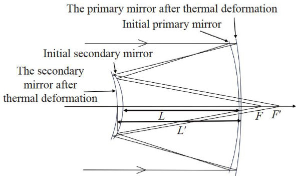 Abstract: Catadioptric space cameras are widely used in space exploration. However, temperature variations can degrade their imaging performance.To address this issue, we present an athermal design for a catadioptric space camera operating over a wide temperature range. Initially,the temperature efects on optical elements,mechanical structures,and other components wereanalyzed,and convenient methods for thermal aberration compensation are summarized. Subsequently, taking a camera with a spectral range of 400- 1000nm , a focal length of 525mm , and an F-number of 3.5 as the design case,an athermal solution is developed. By selecting appropriate materials for the mirror substrates and support structures,and using fused silica as the single lens material to correct aberrations,the optical system maintains stable performance in space environments. Final simulation results confirm that the optimized camera maintains a Modulation Transfer Function (MTF) value above 0.4 at 77lp/mm (Nyquist frequency) over a temperature range of -60∘C to 150∘C . The camera exhibits stable material properties, excellent imaging quality, and consistent performance under extreme temperatures. This design demonstrates significant potential for applications in space exploration and related fields.