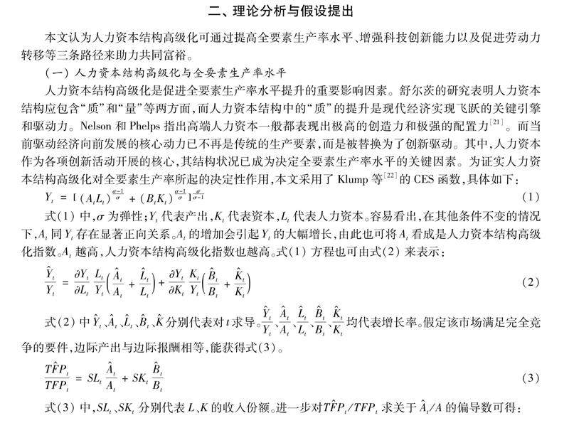 [摘 要]共同富裕是中国式现代化的重要特征,也是中国共产党人为之而奋斗的初心和使命。而人力资本结构高级化则是共同富裕目标实现的重要影响因素。以人力资本结构高级化作为研究切入点,并结合2005—2022年的省级层面数据,实证检验人力资本结构高级化对共同富裕水平的影响及其内在作用机理。研究发现,人力资本结构高级化对中国共同富裕水平的提升有明显的推动作用;异质性分析发现,人力资本结构高级化对不同地区、不同财力、不同技术水平的省份影响呈现显著异质性;机制检验发现,人力资本结构高级化主要通过推动全要素生产率水平提升、增强科技创新能力以及促进劳动力转移等三条路径来助力中国共同富裕水平提升。(剩余17918字)