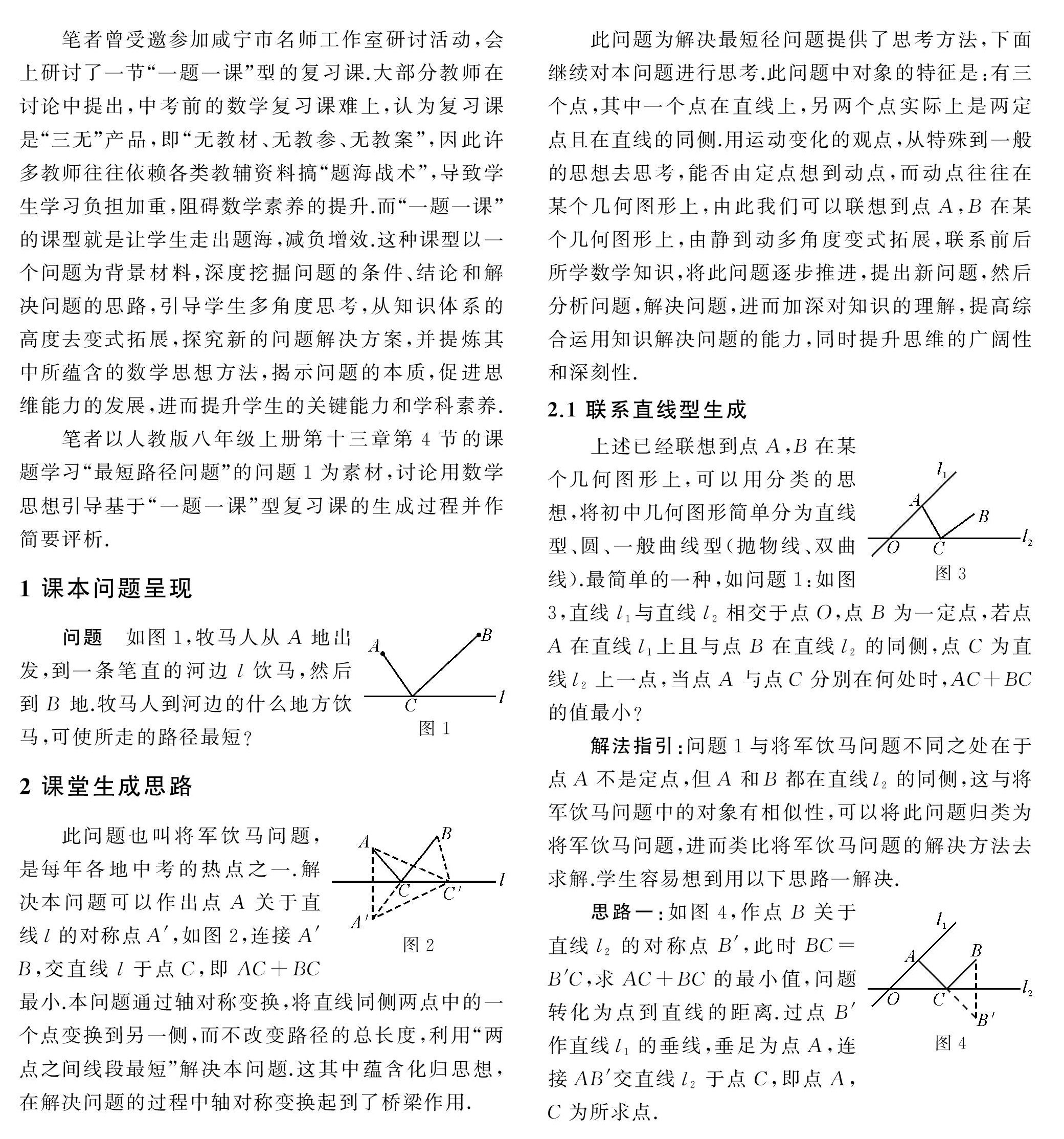 笔者曾受邀参加咸宁市名师工作室研讨活动,会上研讨了一节“一题一课”型的复习课.大部分教师在讨论中提出,中考前的数学复习课难上,认为复习课是“三无”产品,即“无教材、无教参、无教案”,因此许多教师往往依赖各类教辅资料搞“题海战术”,导致学生学习负担加重,阻碍数学素养的提升.而“一题一课”的课型就是让学(剩余4184字)