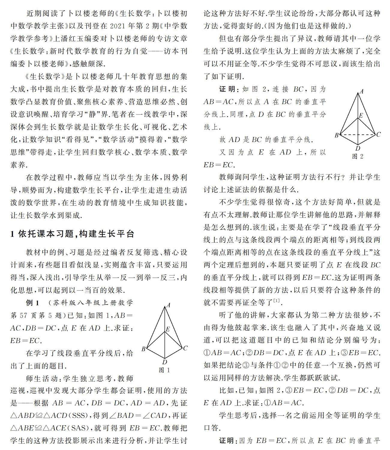 近期阅读了卜以楼老师的《生长数学:卜以楼初中数学教学主张》以及刊登在2021年第2期《中学数学教学参考》上潘红玉编委对卜以楼老师的专访文章《生长数学:新时代数学教育的行为自觉——访本刊编委卜以楼老师》,感触颇深.
