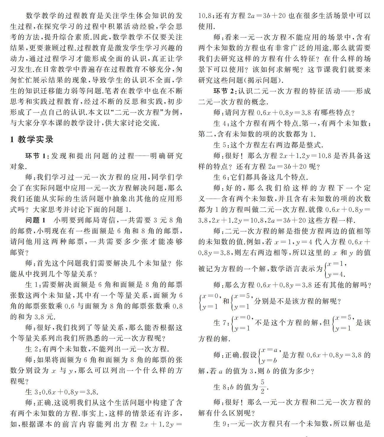 数学教学的过程教育是关注学生体会知识的发生过程,在探究学习的过程中积累活动经验,学会思考的方法,提升综合素质.因此,数学教学不仅要关注结果,更要兼顾过程.过程教育是激发学生学习兴趣的动力,通过过程学习才能形成全面的认识,真正让学习发生.在日常教学中普遍存在过程教育不够充分,匆匆忙忙展示结果的现象,导(剩余637字)