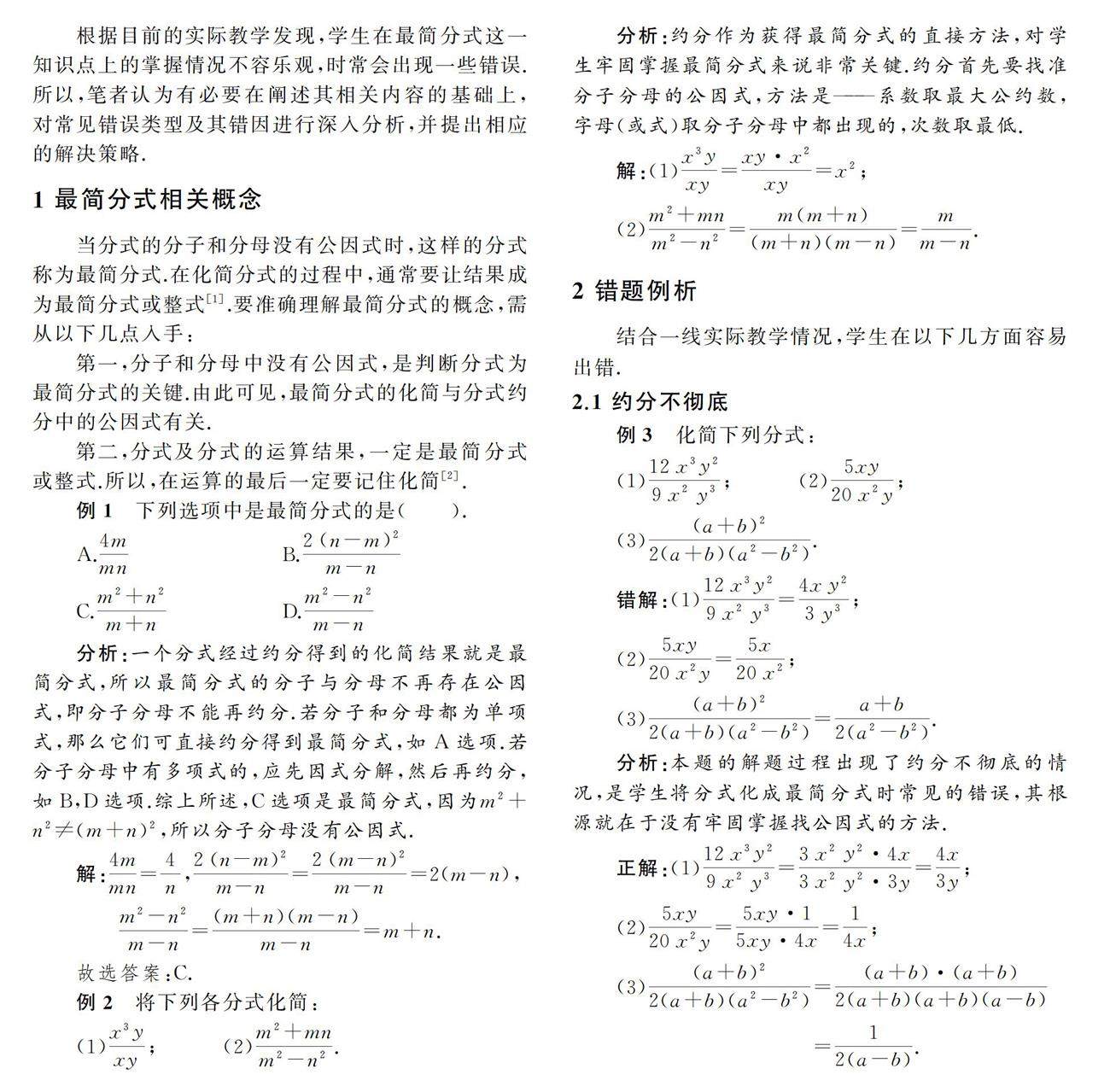 摘要:最简分式是分式的基本性质之后的又一新知识点,其理论基础就是分式的基本性质.根据最简分式的要求,分式及分式的运算结果均需保留最简形式,所以就要对分式进行化简,但是学生在化简时总容易出错.本文中从最简分式的概念入手,结合具体案例展示几种错误解法及分析,并提出相应的策略,可以为学生有效避错提供帮助.(剩余239字)
