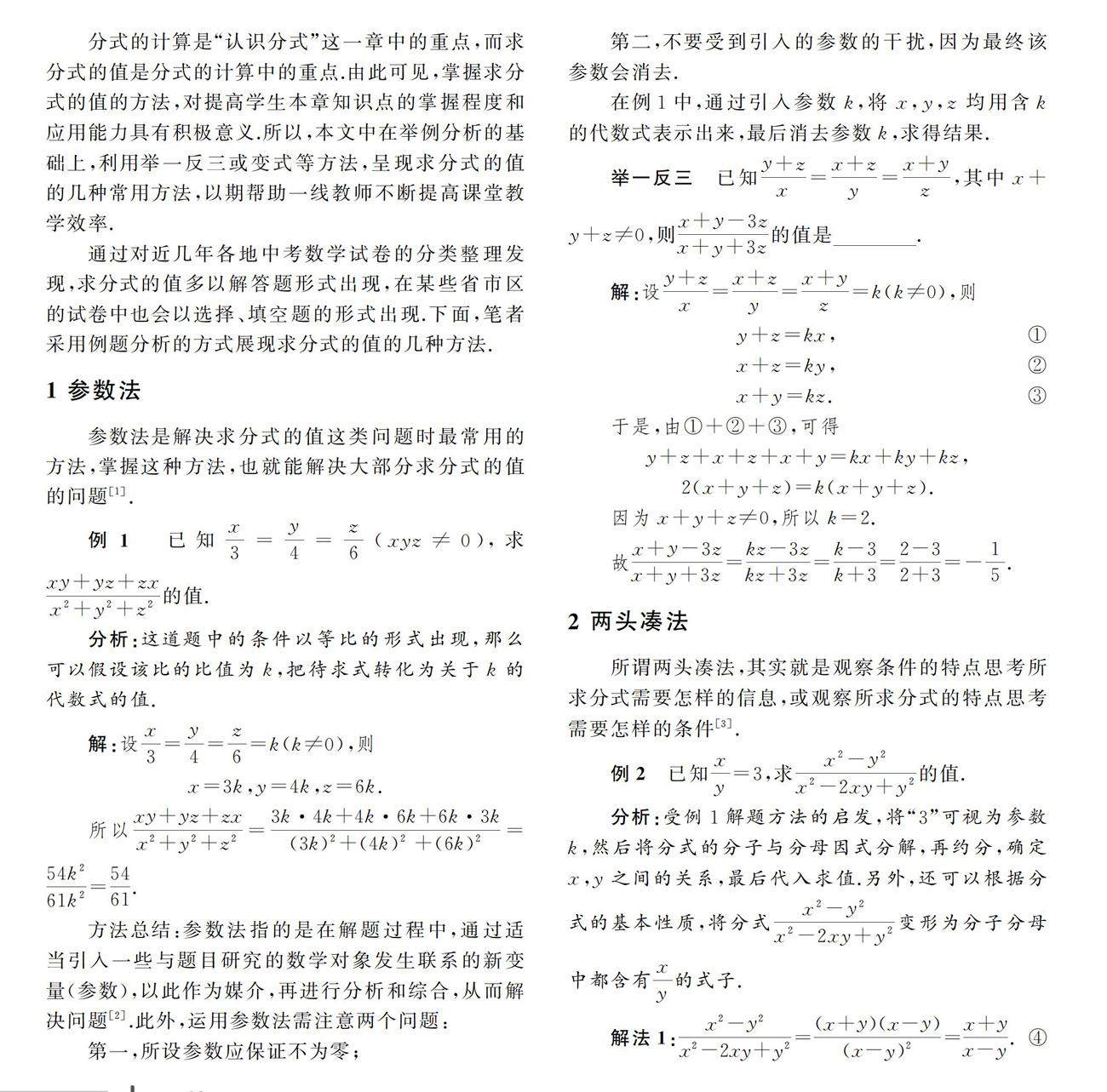 摘要:求分式的值是初中数学“认识分式”这一章中非常重要的知识点,也是中考命题的热点.从近几年的命题情况来看,这类问题越来越灵活,对解题方法的要求越来越高.本文中采用例题分析的方式,为一线教师展现了几种求分式的值的方法.