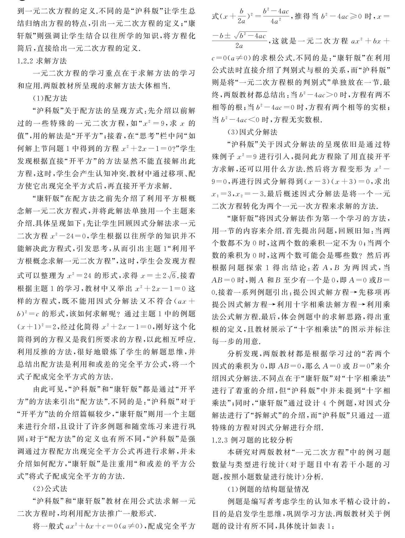 摘要:教材是最重要的文本教学资源,是教师进行教学的主要依据、学生获得系统知识的主要材料.本文中以沪科版、康轩版初中数学教材中“一元二次方程”为研究对象,分别从内容安排、概念呈现、求解方法以及教材中例习题等方面进行对比,分析两版教材设计的异同和可借鉴之处,可为广大一线教师提供教学参考.