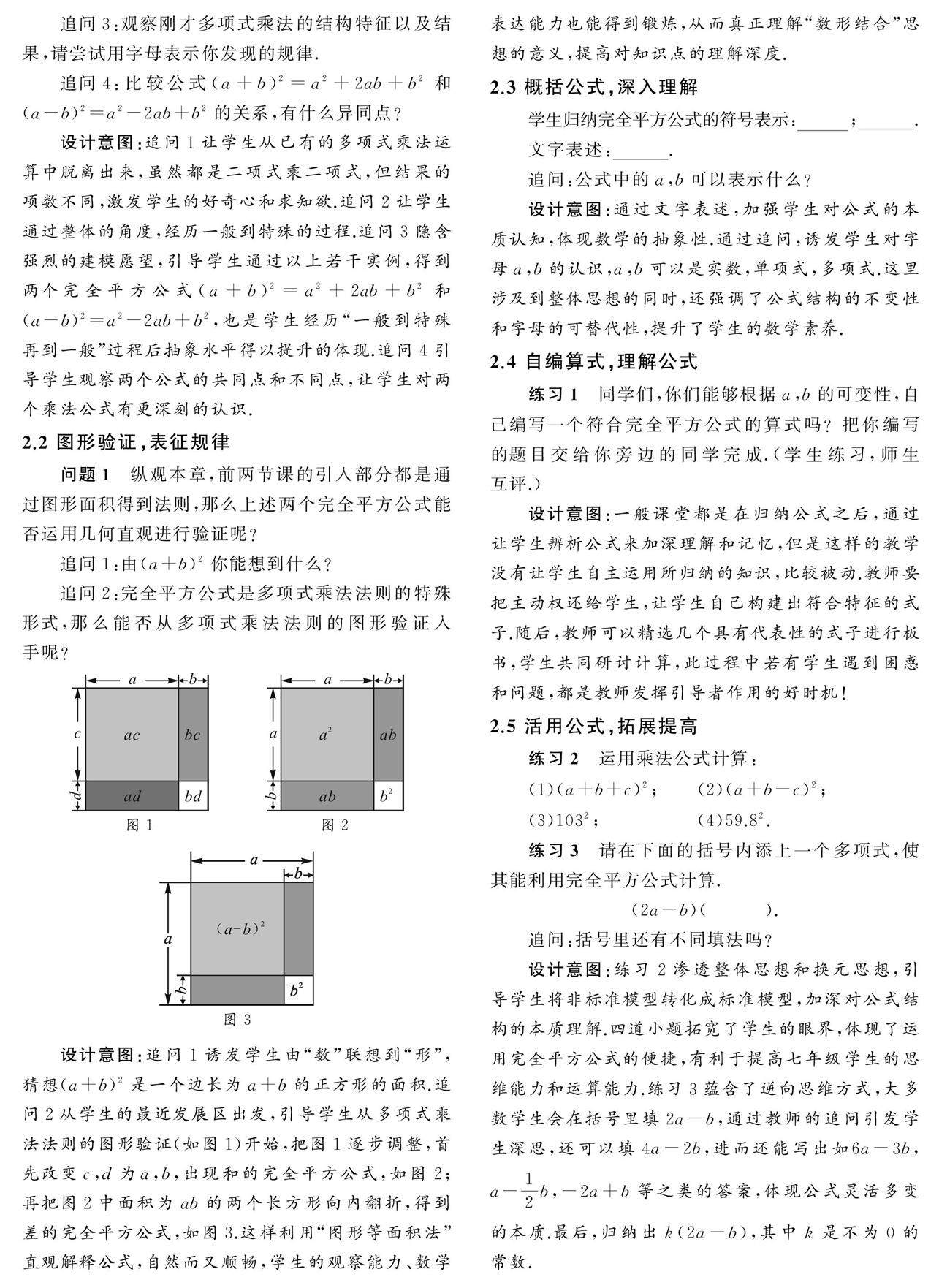 摘要:乘法公式是代数领域中整式乘法运算中的特殊形式,也是培养学生数学素养的重要载体.现以“完全平方公式”的教学为例,通过引导学生经历观察、探索、发现、验证、归纳、应用、小结这7个环节,将“一般与特殊”“几何直观”“数形结合”“化归思想”“整体换元”等数学思想方法渗透在教学之中,从而提高学生的数学能力(剩余4482字)