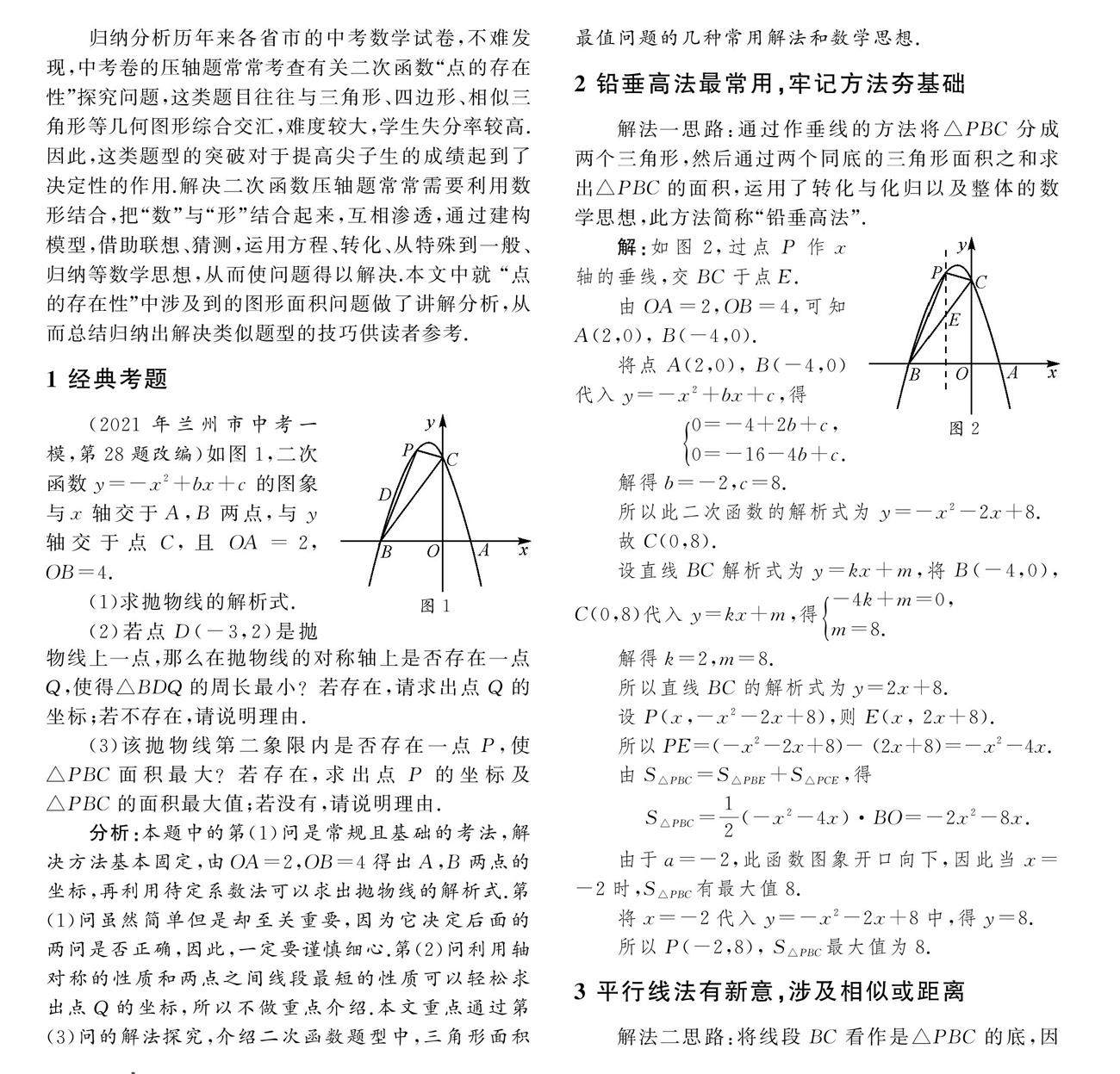 摘要:与二次函数相关的综合性解答题已是各省、市中考数学的必考题型,特别是涉及到几何图形面积最值的问题,是难点,也是易错点.本文中以如何构造辅助线转化问题为导向,详细介绍了铅垂高法、平行线法、割补形法、三角函数法这四种解决二次函数面积最大值问题的方法,使复杂问题简单化,从而为渗透数学思想、发展核心素养(剩余33字)