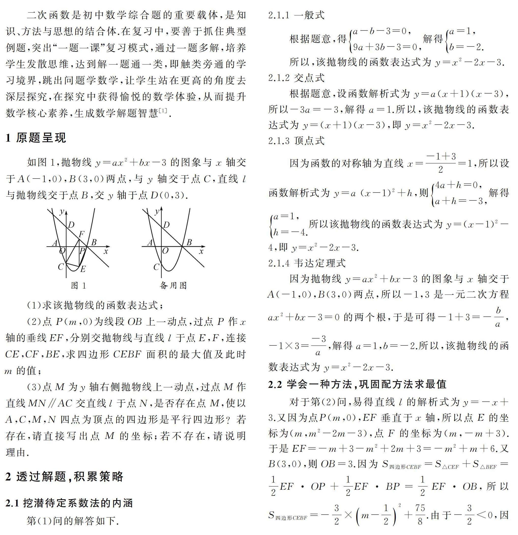 摘要:二次函数是初中数学教学的重点、难点内容,也是中考必考的重要考点之一,既包含利用待定系数法求解析式,利用配方法求最值等基础性知识,也涵盖三角形、四边形等几何图形,以及全等、相似等几何知识,形成了参数多,图象内涵丰富,综合性强等特点,这就需要通过一题多解,积累问题解决的方法和策略.
