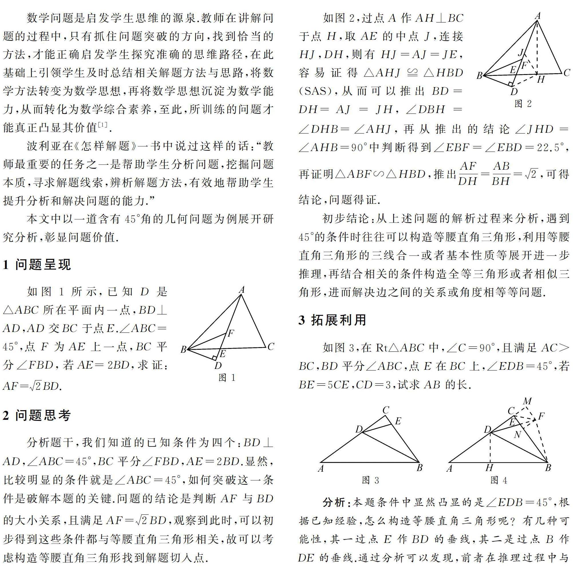 摘要:如何通过问题训练,帮助学生快速分析问题,抓住问题突破口或切入点,提升学生解题的能力?本文中从日常训练过程中所涉及到的含有“45°”角的几个问题展开论述,深挖问题特点,寻求解题突破线索,从而彰显问题的价值.在让学生灵活掌握解题技巧或解题思路的过程中体会问题的本质所在,激发学生解题联想与问题迁移,(剩余2831字)