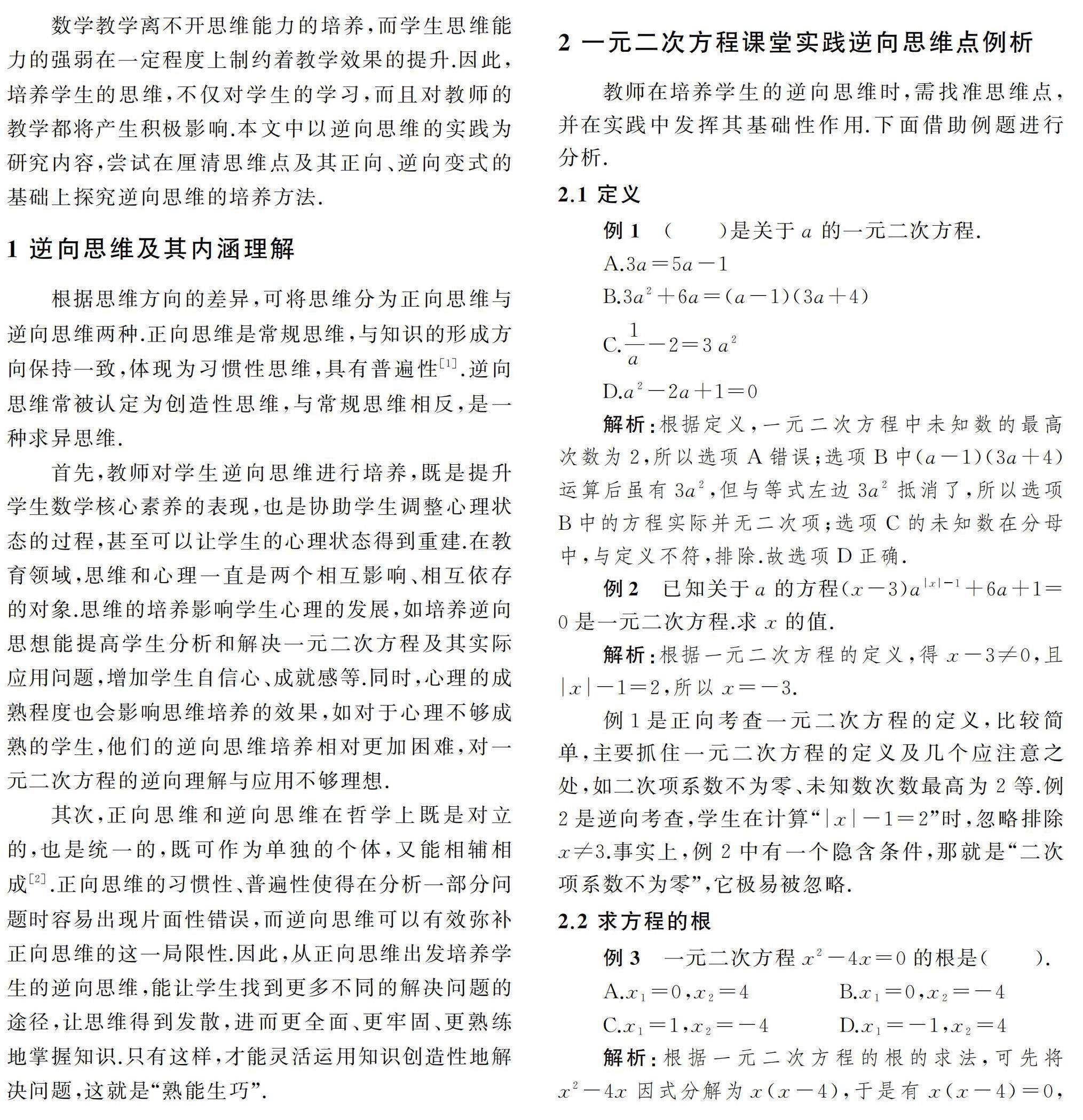 一元二次方程教学实践中的逆向思维研究