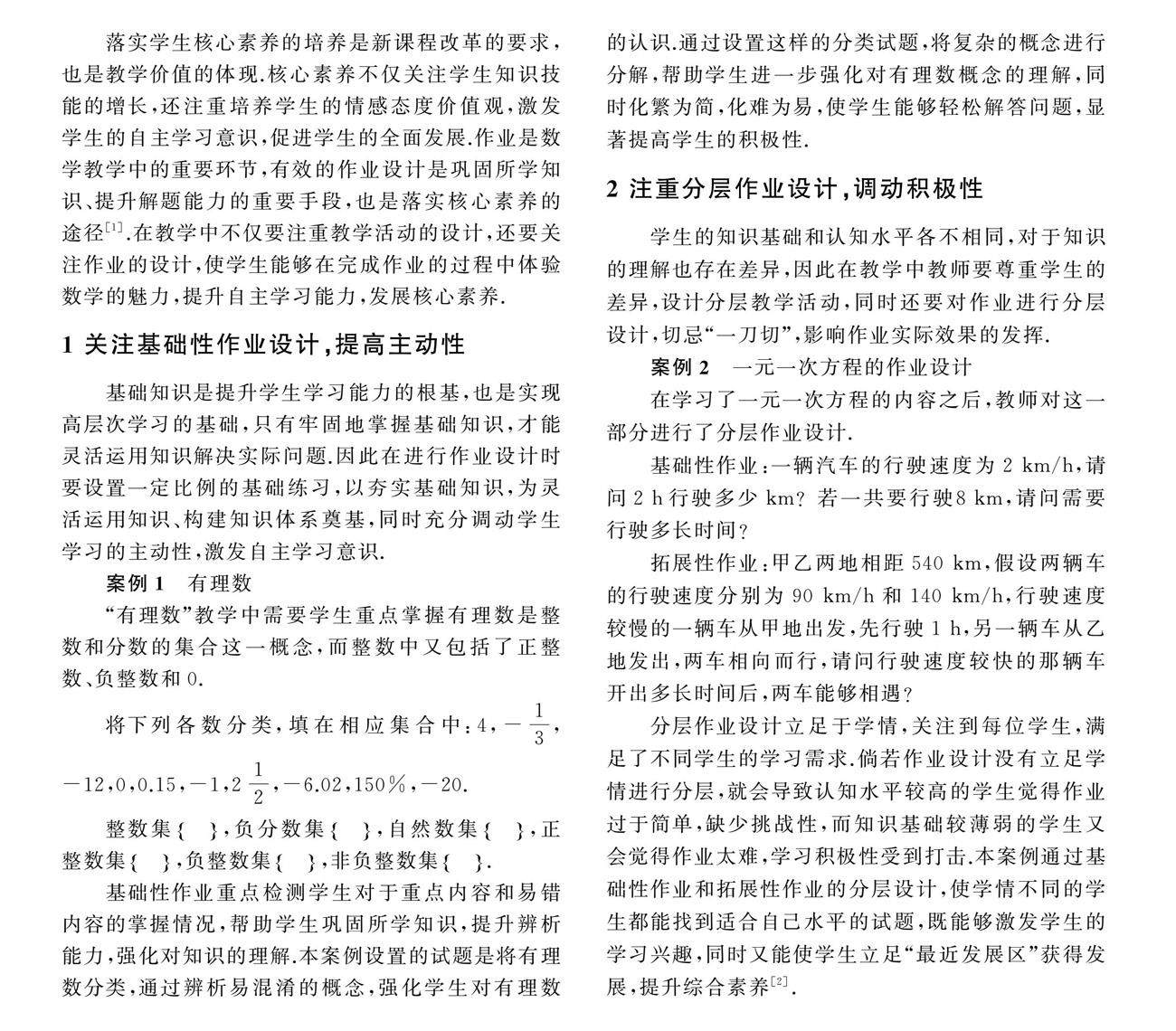 摘要:数学教学不仅要注重知识的传授,还要将知识内化为学生的综合素养,使学生通过学习提升关键能力和数学素养.教师要重视作业设计在巩固知识、提升素养方面的重要价值,关注基础性作业、分层作业、探究作业、开放型作业和融合作业设计,提升作业的有效性.