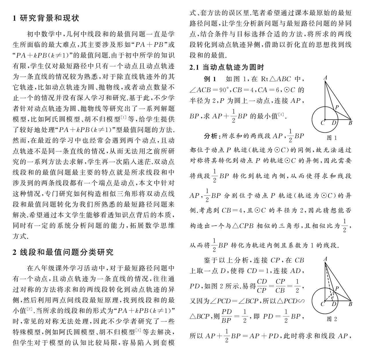 摘要:线段和的最值问题是中考中经常会考到的难点和热点,学生对于这类最值问题没有一个清晰的解决思路,往往无从下手.如何迅速从题目条件中找到突破口将线段和的最值问题转化为熟悉的常用方法去解决,是学生所面临的比较大的难点.本文中主要探讨如何构造相似三角形将复杂的线段和问题转化为课本上常见的最短路径问题来处(剩余1512字)