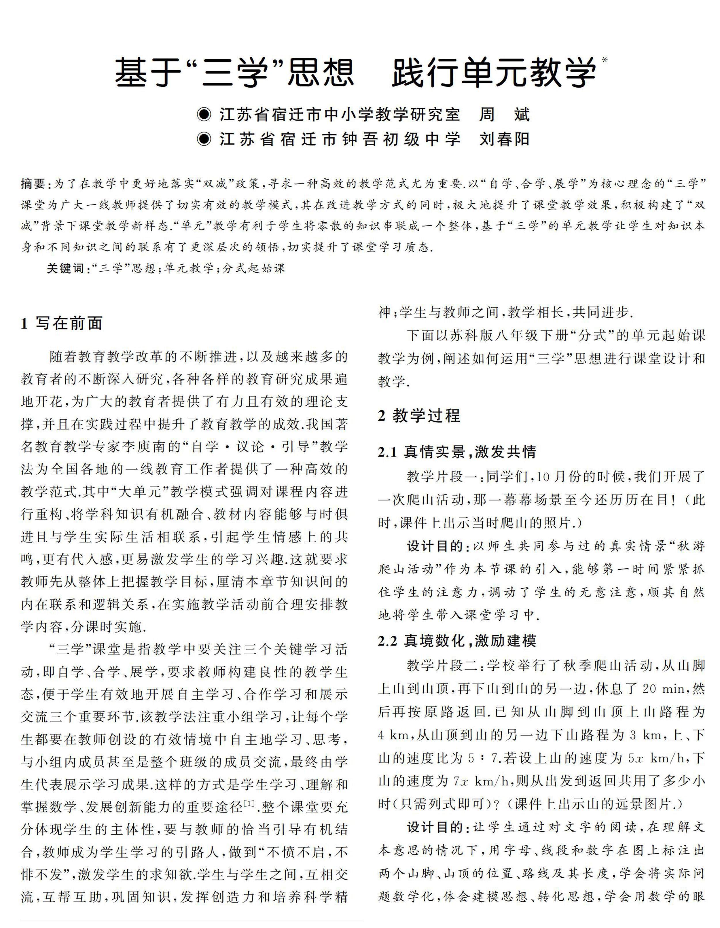 摘要:为了在教学中更好地落实“双减”政策,寻求一种高效的教学范式尤为重要.以“自学、合学、展学”为核心理念的“三学”课堂为广大一线教师提供了切实有效的教学模式,其在改进教学方式的同时,极大地提升了课堂教学效果,积极构建了“双减”背景下课堂教学新样态.“单元”教学有利于学生将零散的知识串联成一个整体,(剩余4602字)