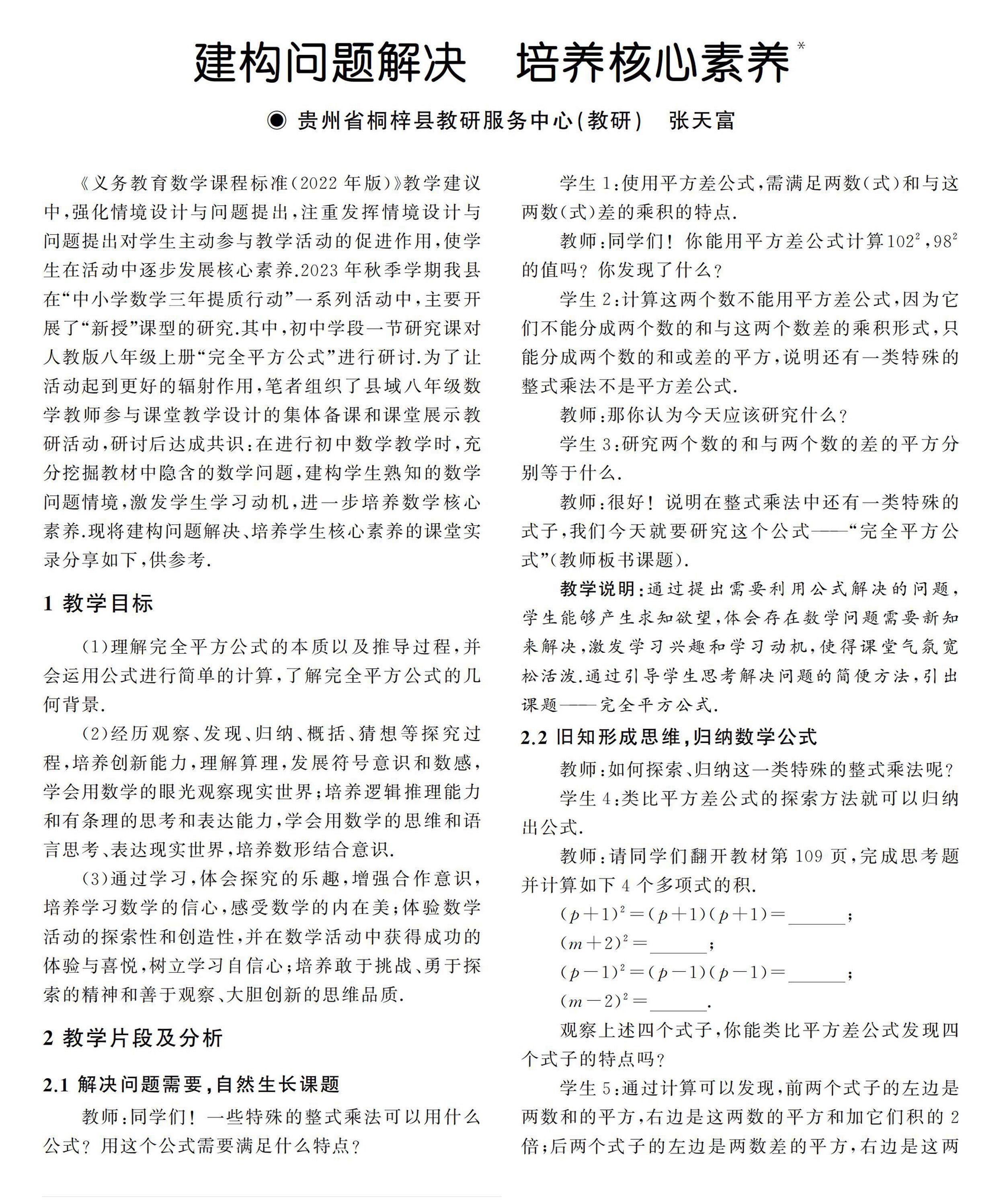 《义务教育数学课程标准(2022年版)》教学建议中,强化情境设计与问题提出,注重发挥情境设计与问题提出对学生主动参与教学活动的促进作用,使学生在活动中逐步发展核心素养.2023年秋季学期我县在“中小学数学三年提质行动”一系列活动中,主要开展了“新授”课型的研究.其中,初中学段一节研究课对人教版八年级(剩余4663字)