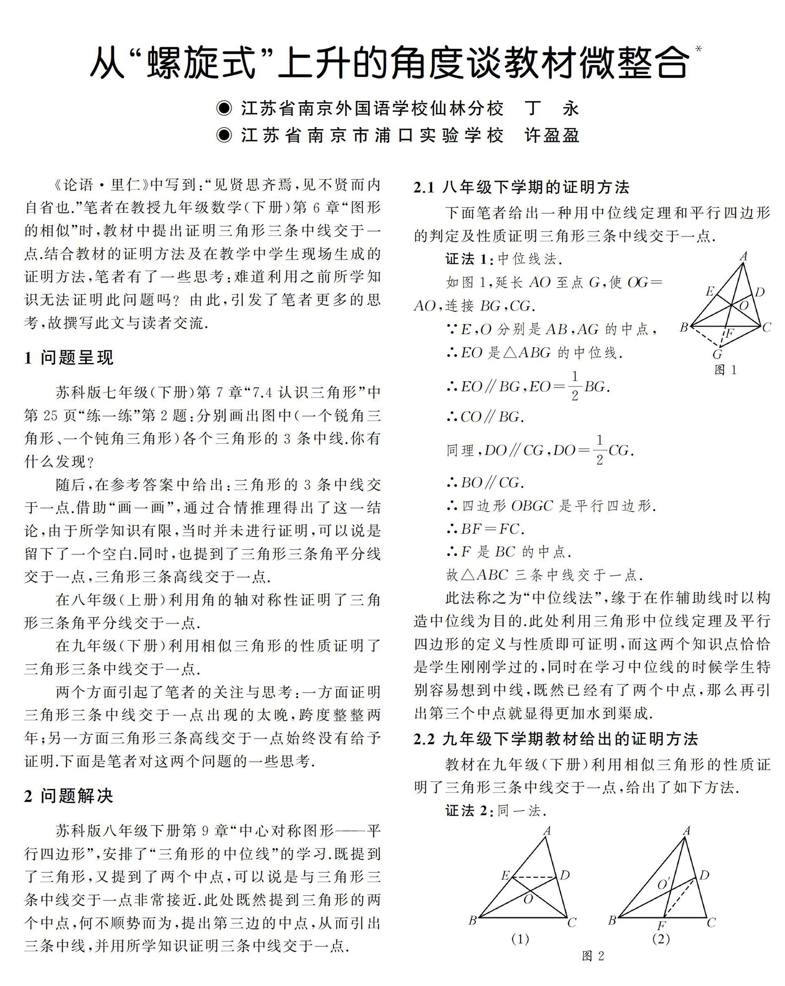 《论语·里仁》中写到:“见贤思齐焉,见不贤而内自省也.”笔者在教授九年级数学(下册)第6章“图形的相似”时,教材中提出证明三角形三条中线交于一点.结合教材的证明方法及在教学中学生现场生成的证明方法,笔者有了一些思考:难道利用之前所学知识无法证明此问题吗?由此,引发了笔者更多的思考,故撰写此文与读者交(剩余4014字)