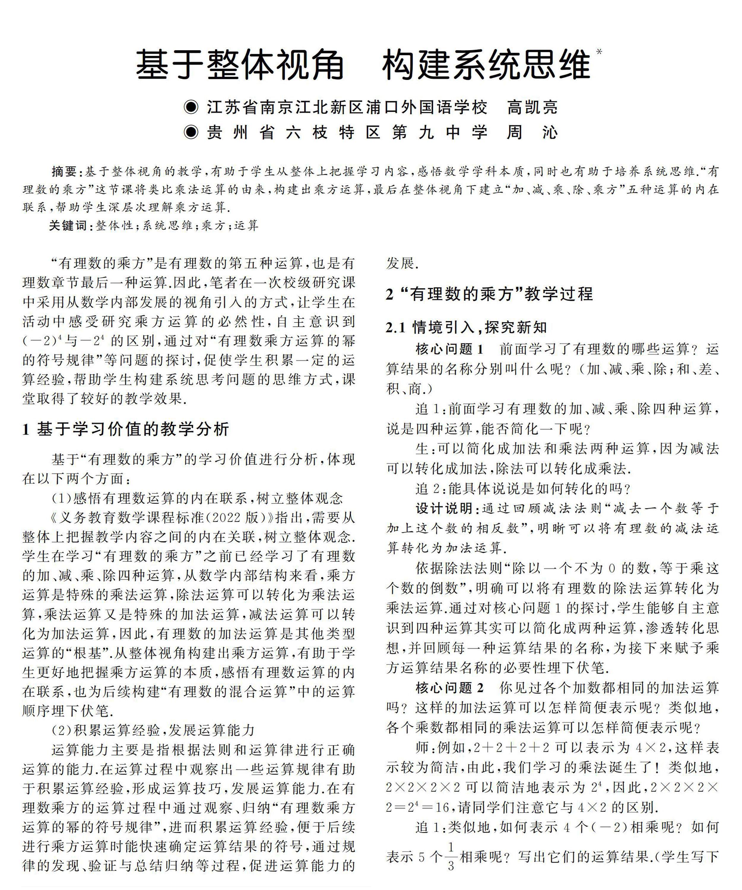 摘要:基于整体视角的教学,有助于学生从整体上把握学习内容,感悟数学学科本质,同时也有助于培养系统思维.“有理数的乘方”这节课将类比乘法运算的由来,构建出乘方运算,最后在整体视角下建立“加、减、乘、除、乘方”五种运算的内在联系,帮助学生深层次理解乘方运算.