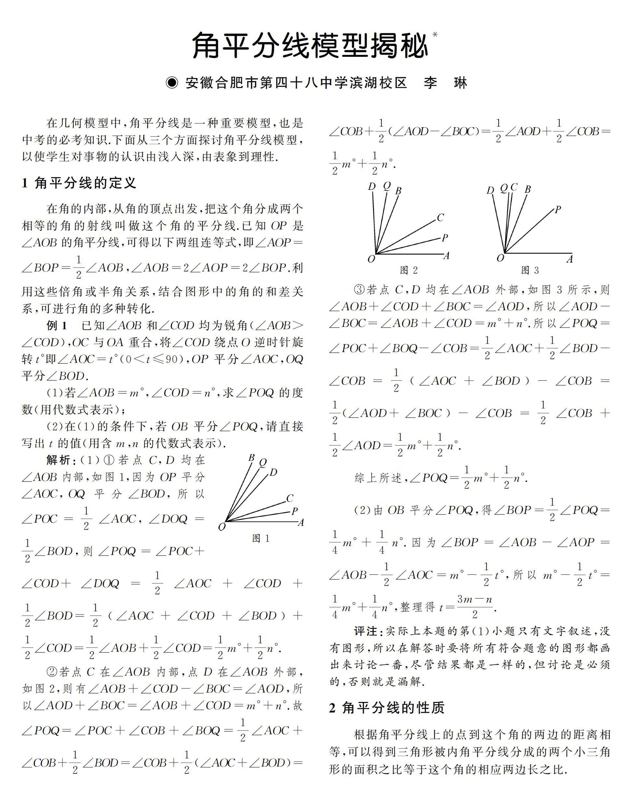 在几何模型中,角平分线是一种重要模型,也是中考的必考知识.下面从三个方面探讨角平分线模型,以使学生对事物的认识由浅入深,由表象到理性.