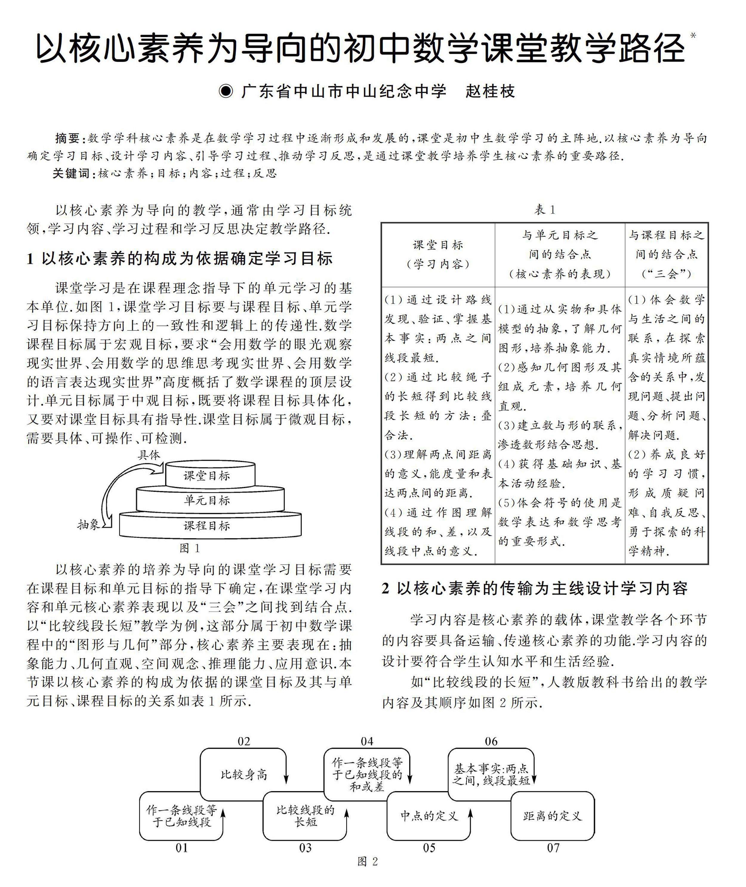 摘要:数学学科核心素养是在数学学习过程中逐渐形成和发展的,课堂是初中生数学学习的主阵地.以核心素养为导向确定学习目标、设计学习内容、引导学习过程、推动学习反思,是通过课堂教学培养学生核心素养的重要路径.