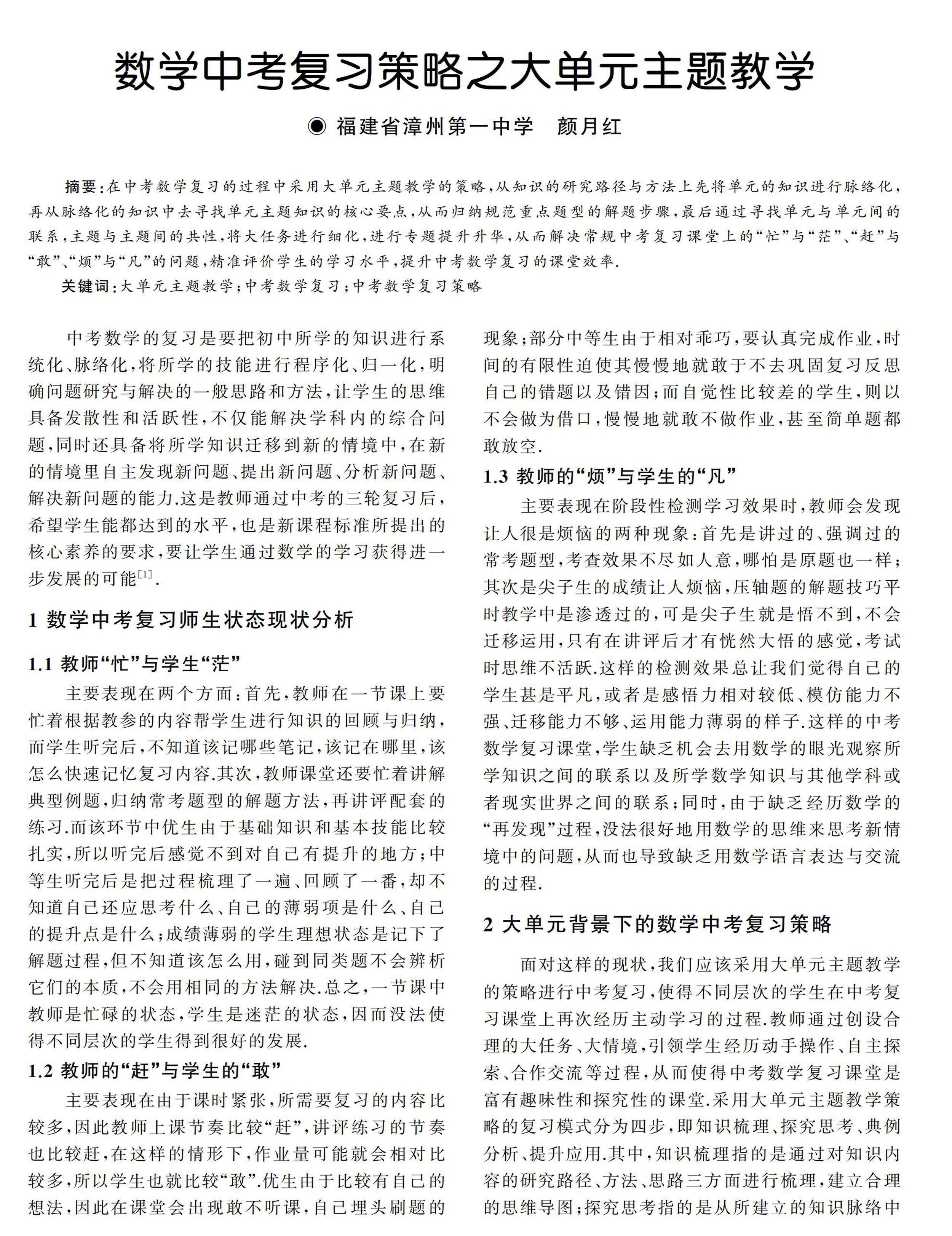摘要:在中考数学复习的过程中采用大单元主题教学的策略,从知识的研究路径与方法上先将单元的知识进行脉络化,再从脉络化的知识中去寻找单元主题知识的核心要点,从而归纳规范重点题型的解题步骤,最后通过寻找单元与单元间的联系,主题与主题间的共性,将大任务进行细化,进行专题提升升华,从而解决常规中考复习课堂上的(剩余4554字)