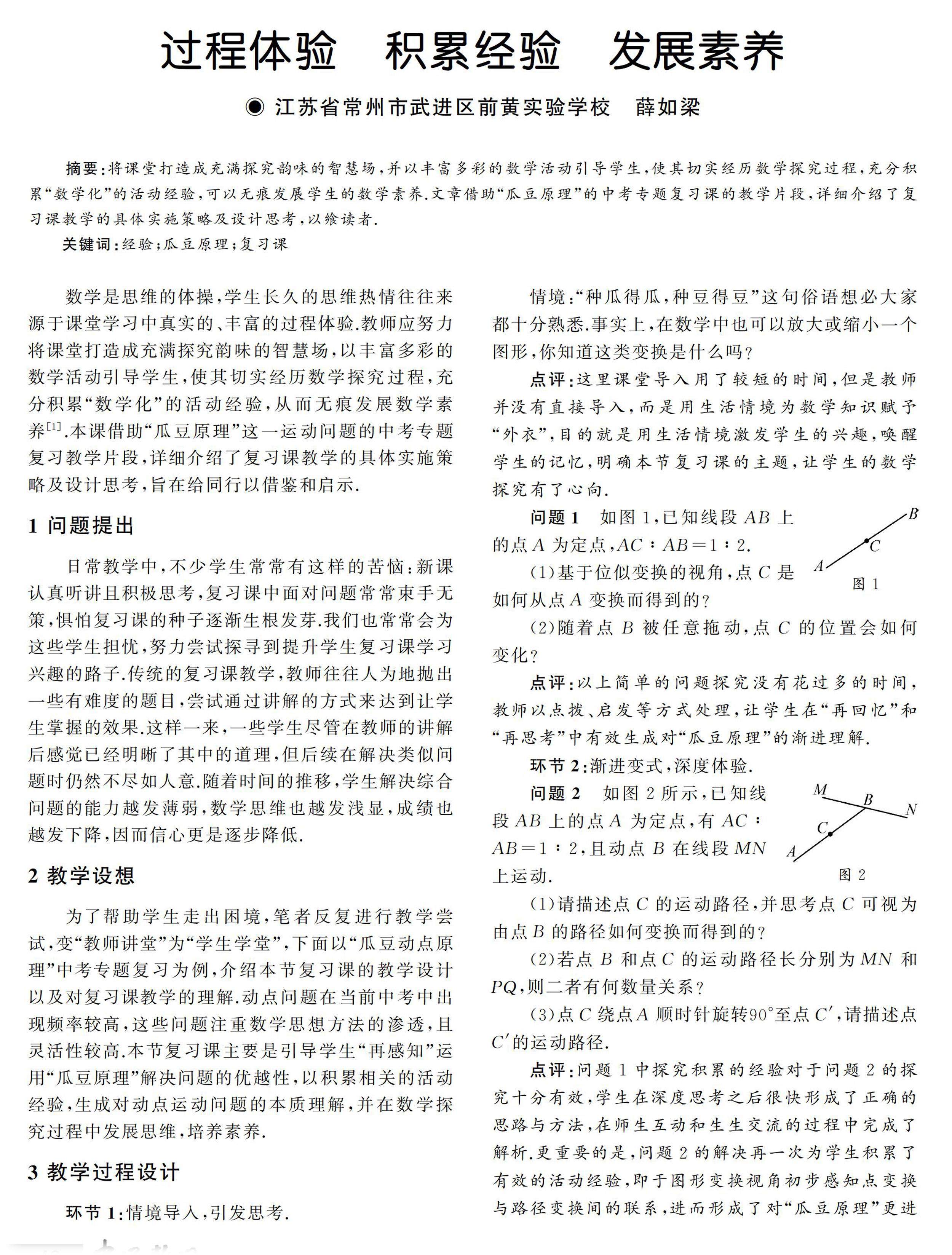 摘要:将课堂打造成充满探究韵味的智慧场,并以丰富多彩的数学活动引导学生,使其切实经历数学探究过程,充分积累“数学化”的活动经验,可以无痕发展学生的数学素养.文章借助“瓜豆原理”的中考专题复习课的教学片段,详细介绍了复习课教学的具体实施策略及设计思考,以飨读者.