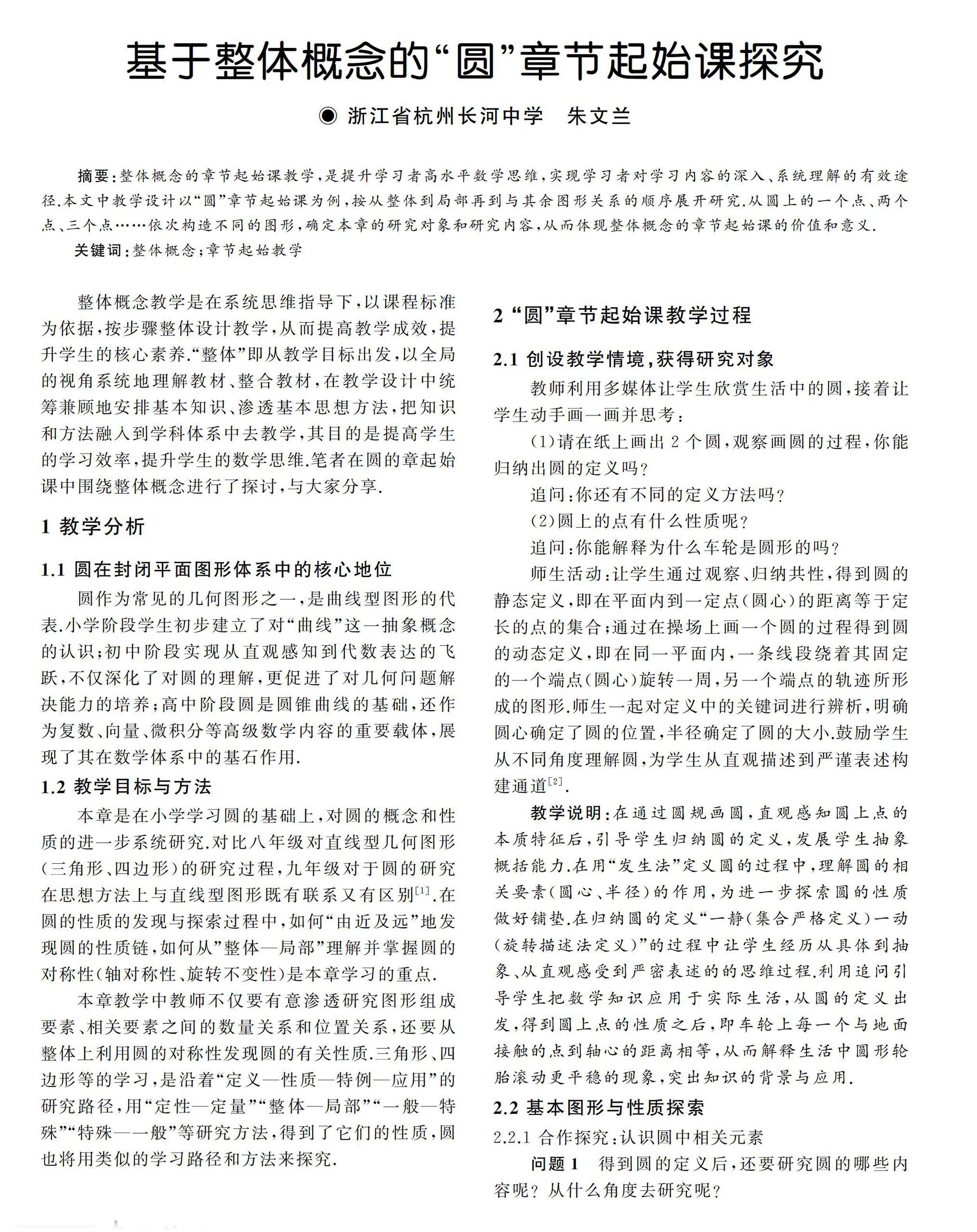 摘要:整体概念的章节起始课教学,是提升学习者高水平数学思维,实现学习者对学习内容的深入、系统理解的有效途径.本文中教学设计以“圆”章节起始课为例,按从整体到局部再到与其余图形关系的顺序展开研究.从圆上的一个点、两个点、三个点……依次构造不同的图形,确定本章的研究对象和研究内容,从而体现整体概念的章节(剩余3822字)