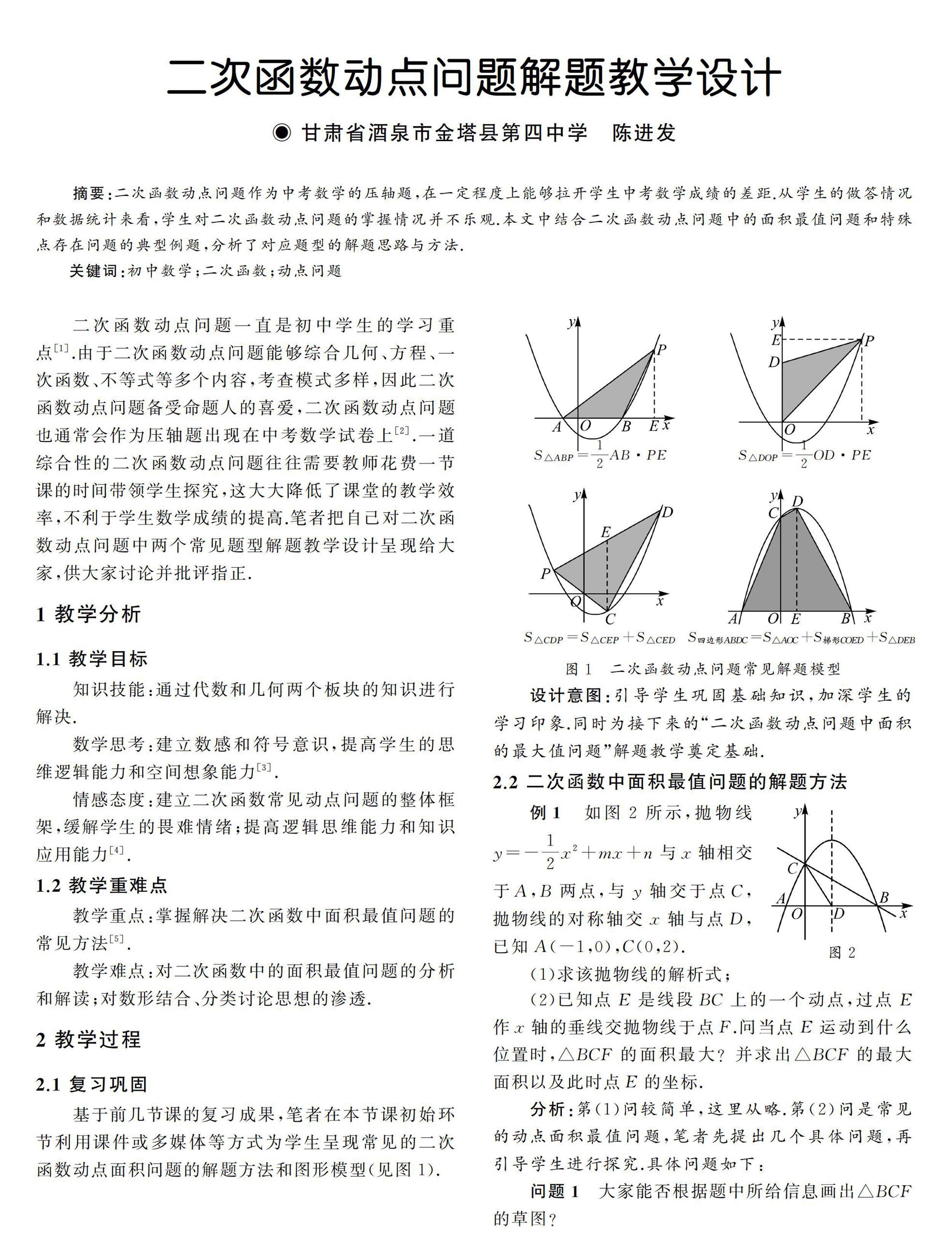 摘要:二次函数动点问题作为中考数学的压轴题,在一定程度上能够拉开学生中考数学成绩的差距.从学生的做答情况和数据统计来看,学生对二次函数动点问题的掌握情况并不乐观.本文中结合二次函数动点问题中的面积最值问题和特殊点存在问题的典型例题,分析了对应题型的解题思路与方法.