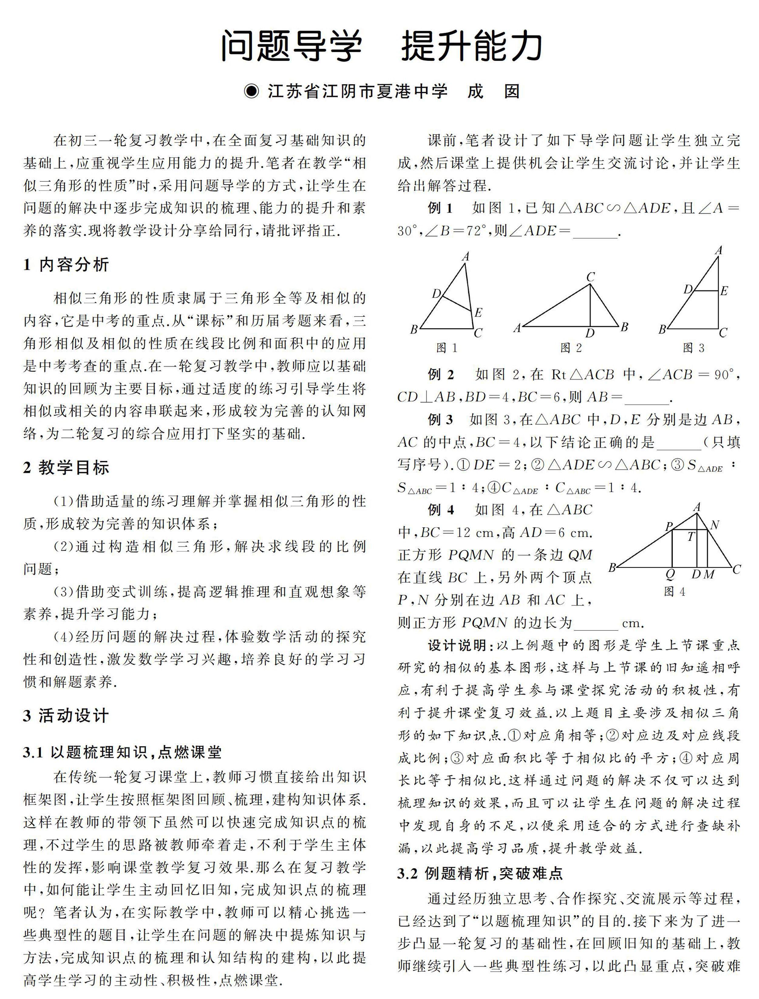 在初三一轮复习教学中,在全面复习基础知识的基础上,应重视学生应用能力的提升.笔者在教学“相似三角形的性质”时,采用问题导学的方式,让学生在问题的解决中逐步完成知识的梳理、能力的提升和素养的落实.现将教学设计分享给同行,请批评指正.