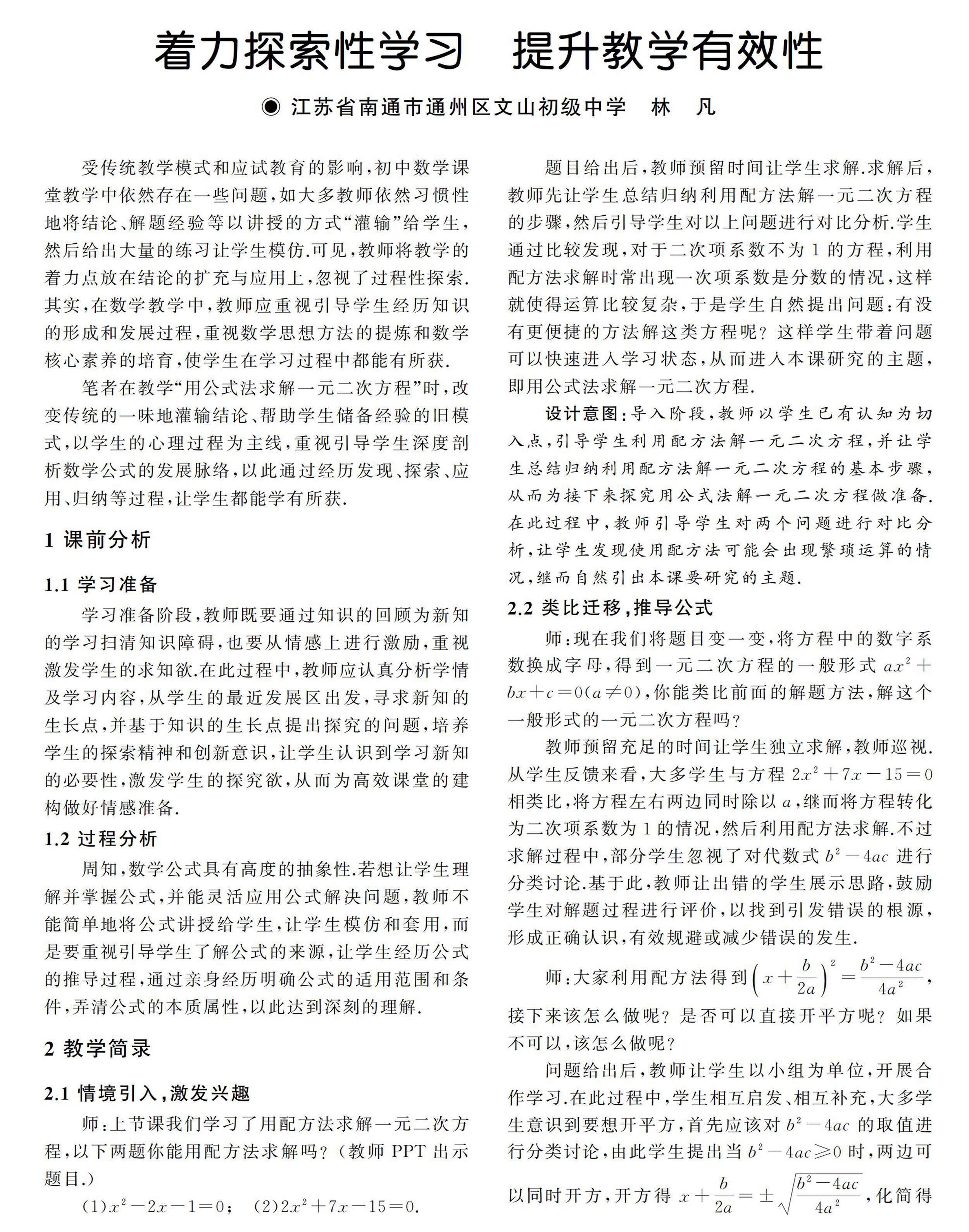 受传统教学模式和应试教育的影响,初中数学课堂教学中依然存在一些问题,如大多教师依然习惯性地将结论、解题经验等以讲授的方式“灌输”给学生,然后给出大量的练习让学生模仿.可见,教师将教学的着力点放在结论的扩充与应用上,忽视了过程性探索.其实,在数学教学中,教师应重视引导学生经历知识的形成和发展过程,重视(剩余3296字)