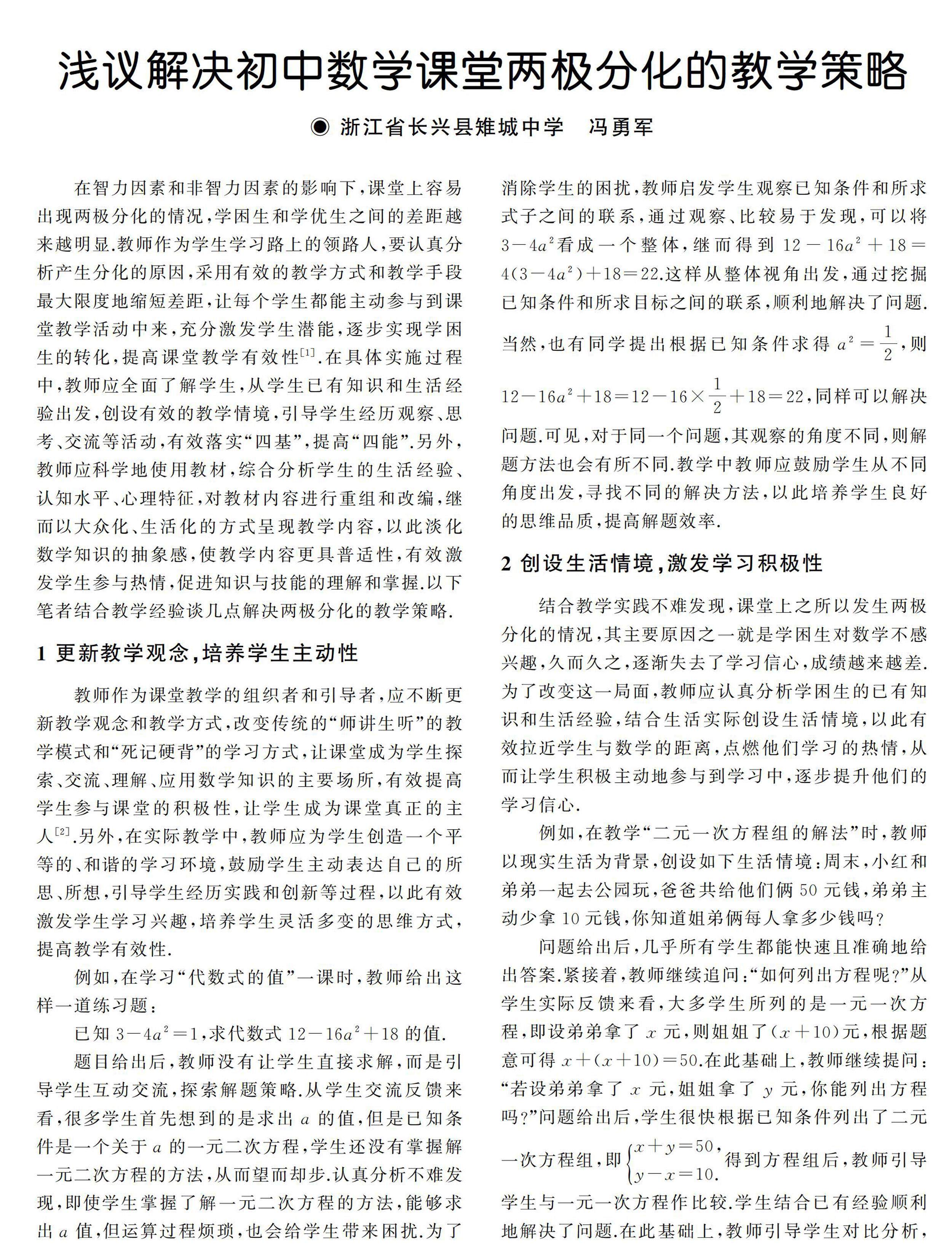 在智力因素和非智力因素的影响下,课堂上容易出现两极分化的情况,学困生和学优生之间的差距越来越明显.教师作为学生学习路上的领路人,要认真分析产生分化的原因,采用有效的教学方式和教学手段最大限度地缩短差距,让每个学生都能主动参与到课堂教学活动中来,充分激发学生潜能,逐步实现学困生的转化,提高课堂教学有效(剩余3195字)