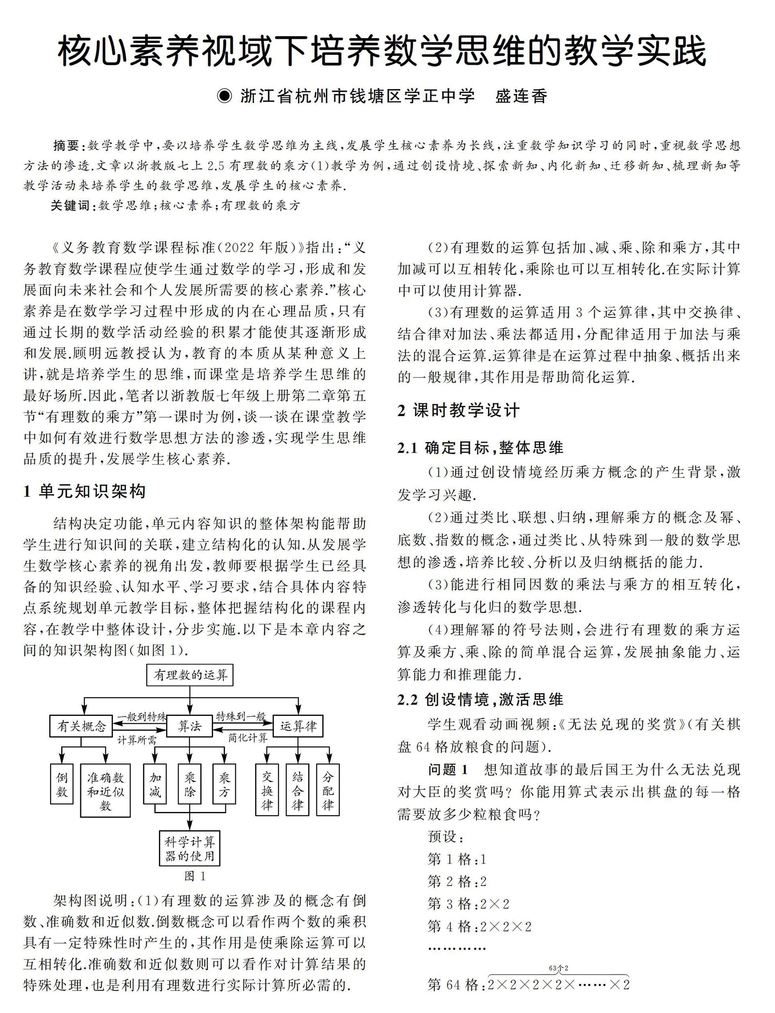 摘要:数学教学中,要以培养学生数学思维为主线,发展学生核心素养为长线,注重数学知识学习的同时,重视数学思想方法的渗透.文章以浙教版七上2.5有理数的乘方(1)教学为例,通过创设情境、探索新知、内化新知、迁移新知、梳理新知等教学活动来培养学生的数学思维,发展学生的核心素养.