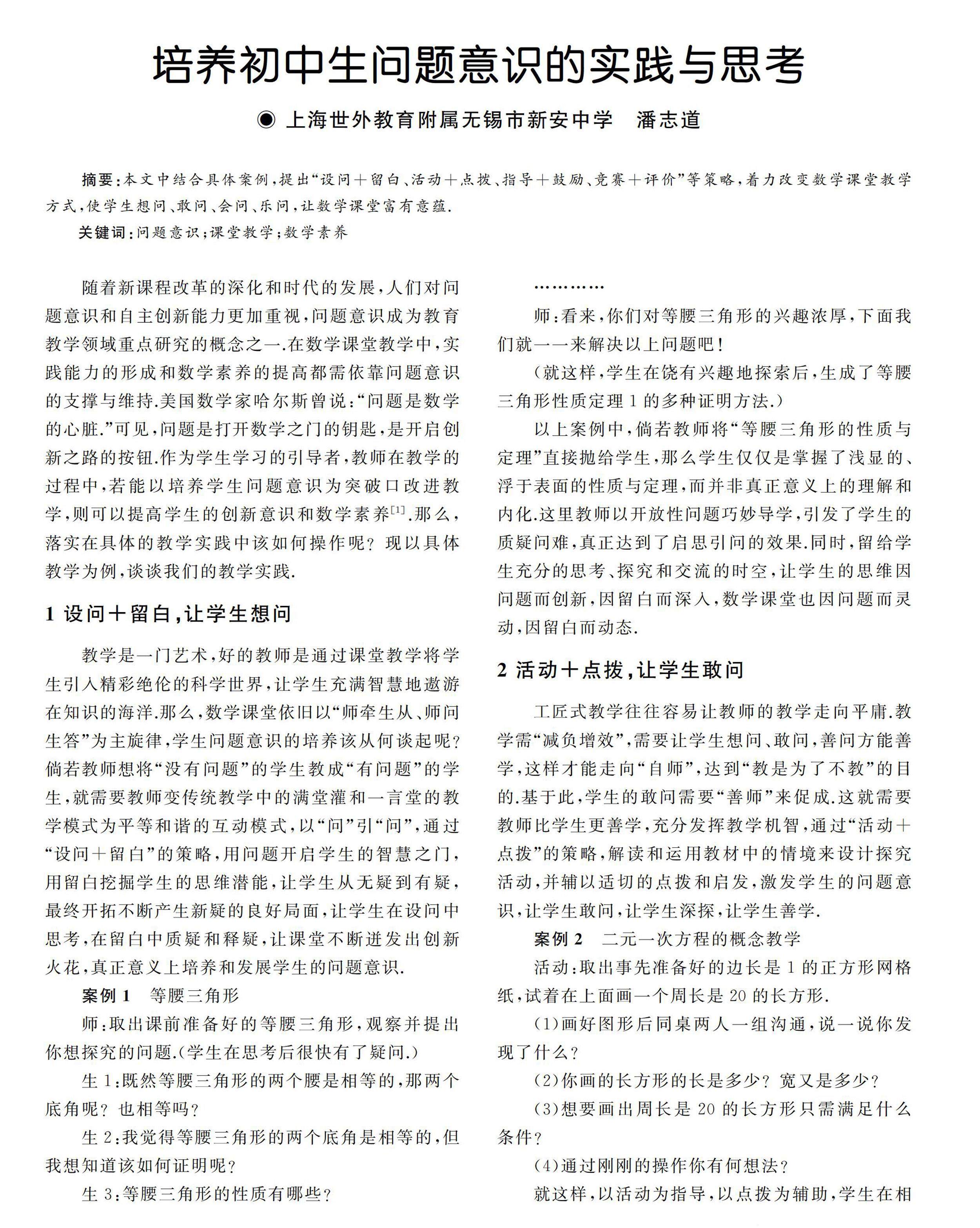 摘要:本文中结合具体案例,提出“设问+留白、活动+点拨、指导+鼓励、竞赛+评价”等策略,着力改变数学课堂教学方式,使学生想问、敢问、会问、乐问,让数学课堂富有意蕴.