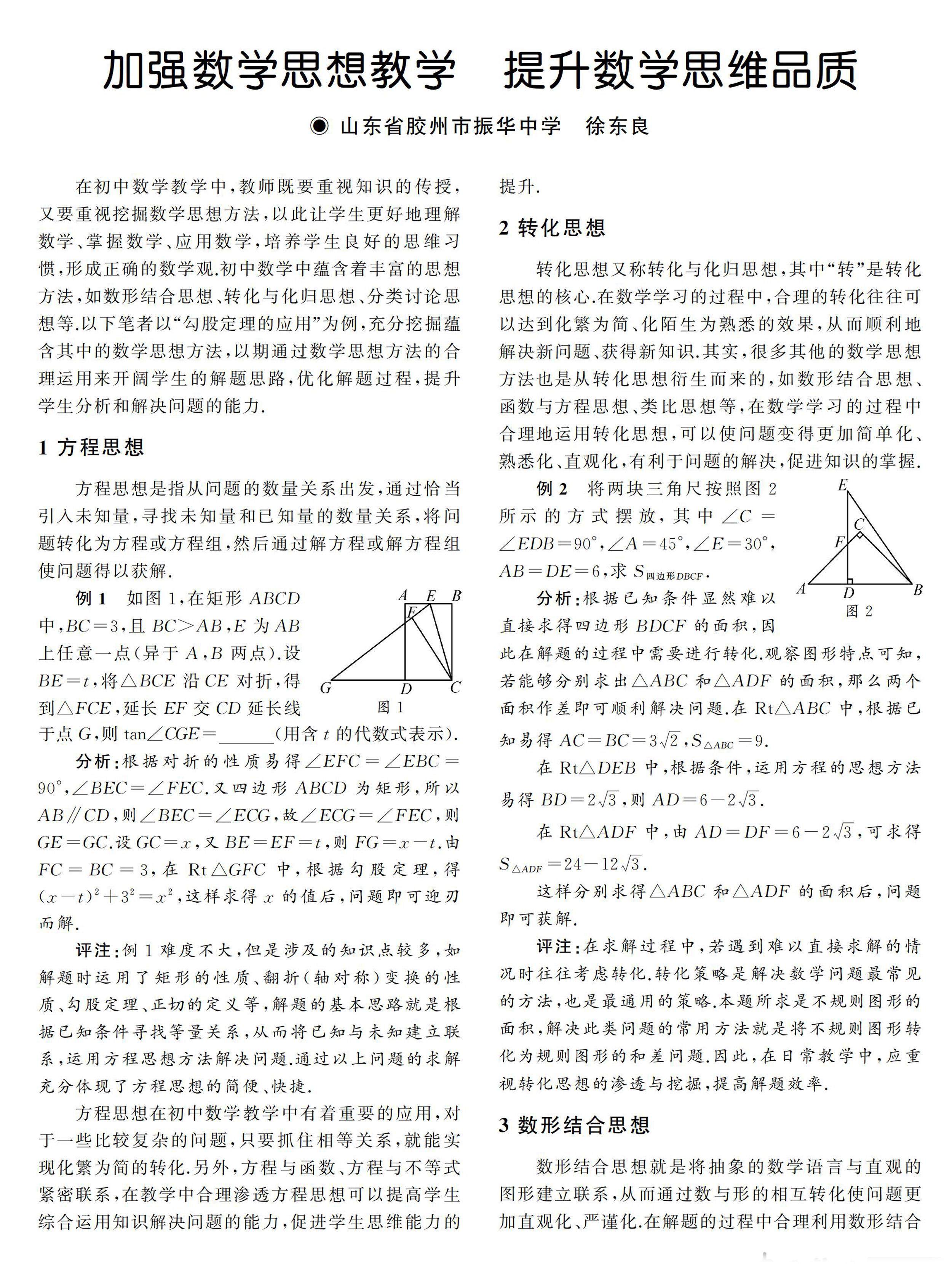 在初中数学教学中,教师既要重视知识的传授,又要重视挖掘数学思想方法,以此让学生更好地理解数学、掌握数学、应用数学,培养学生良好的思维习惯,形成正确的数学观.初中数学中蕴含着丰富的思想方法,如数形结合思想、转化与化归思想、分类讨论思想等.以下笔者以“勾股定理的应用”为例,充分挖掘蕴含其中的数学思想方法(剩余3236字)