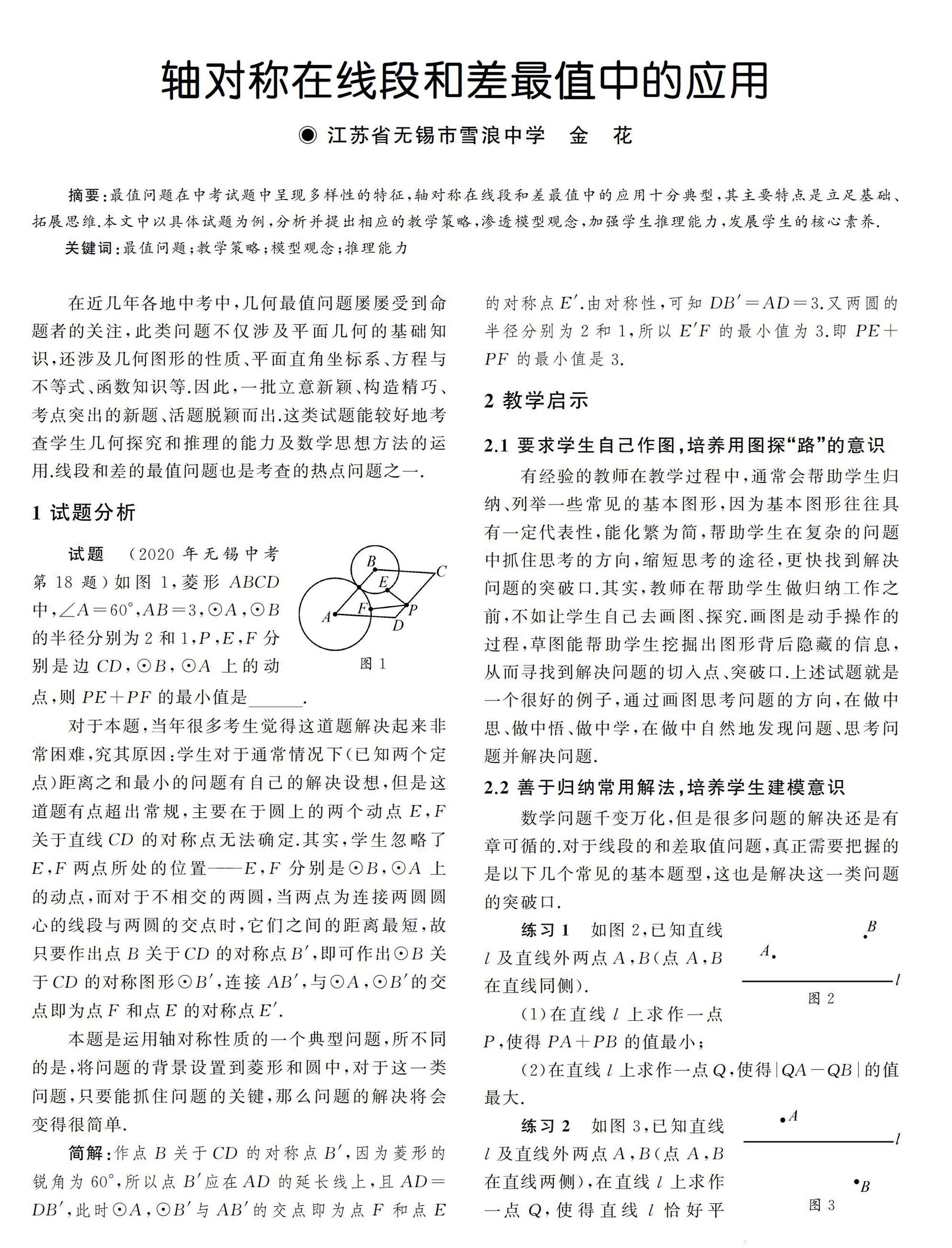 摘要:最值问题在中考试题中呈现多样性的特征,轴对称在线段和差最值中的应用十分典型,其主要特点是立足基础、拓展思维.本文中以具体试题为例,分析并提出相应的教学策略,渗透模型观念,加强学生推理能力,发展学生的核心素养.
