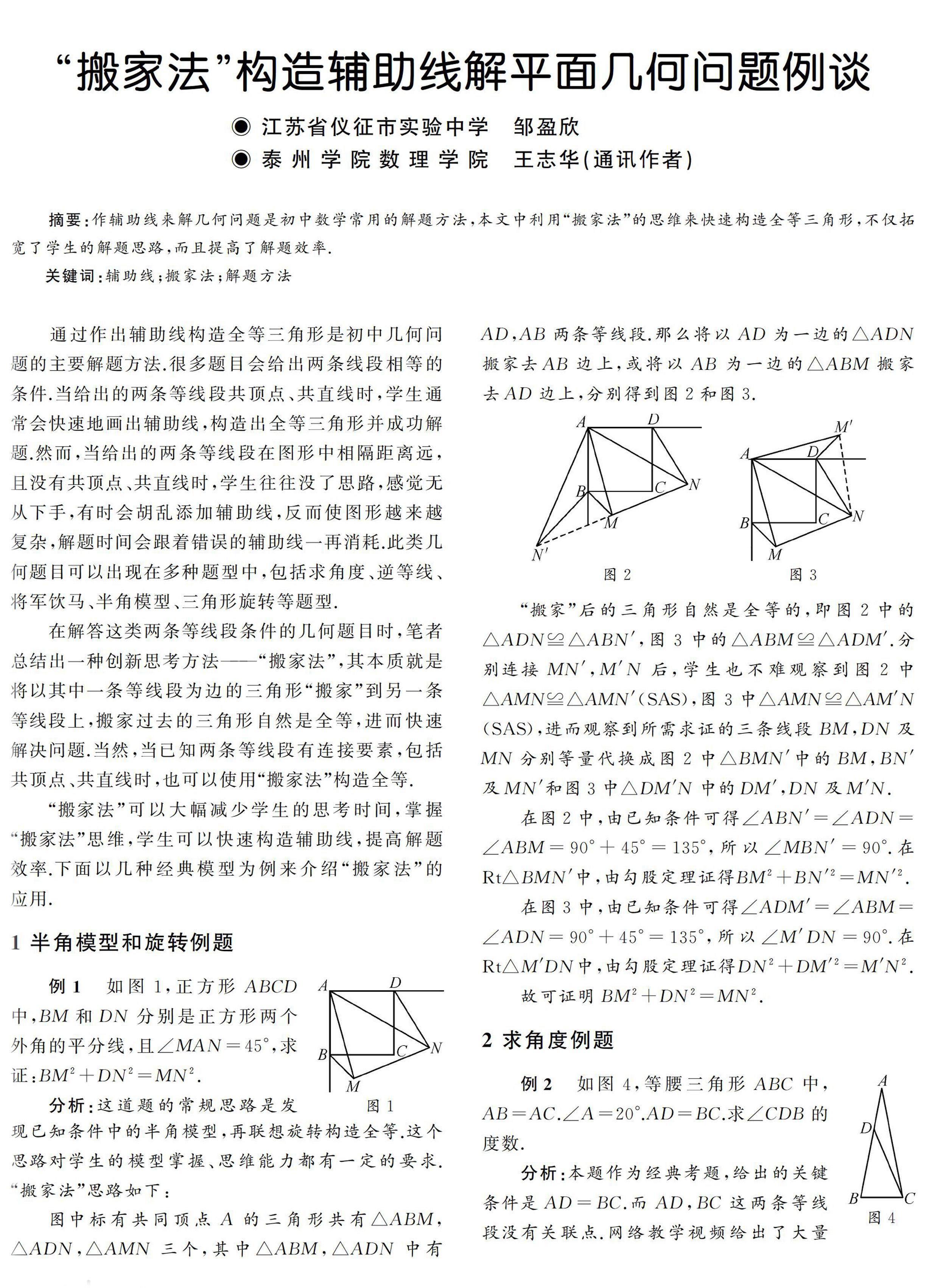 摘要:作辅助线来解几何问题是初中数学常用的解题方法,本文中利用“搬家法”的思维来快速构造全等三角形,不仅拓宽了学生的解题思路,而且提高了解题效率.