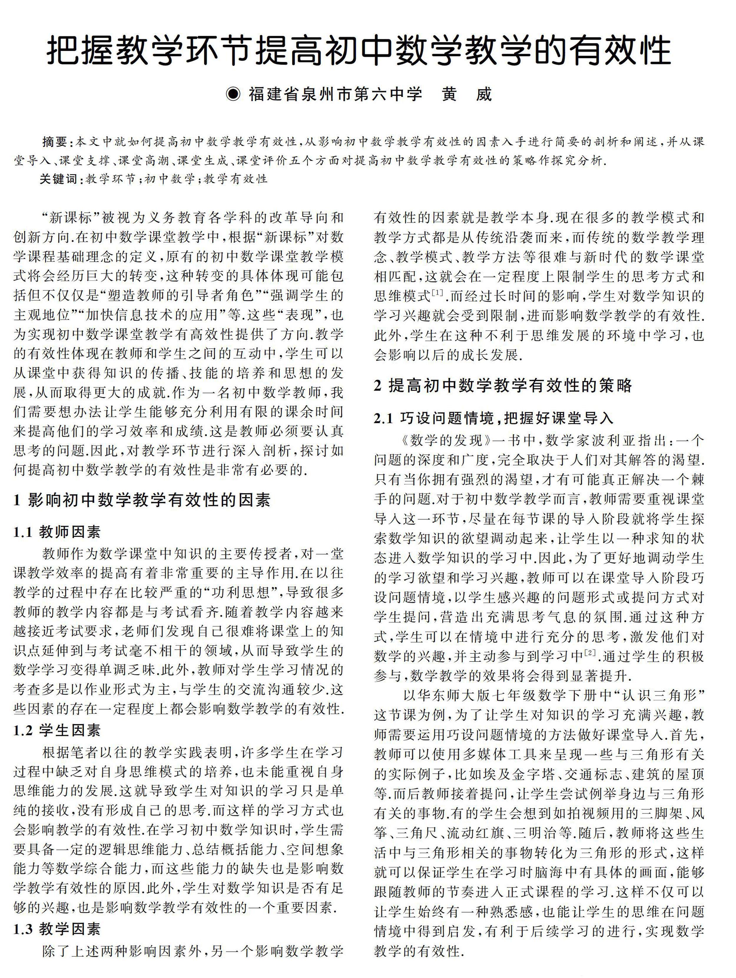 摘要:本文中就如何提高初中数学教学有效性,从影响初中数学教学有效性的因素入手进行简要的剖析和阐述,并从课堂导入、课堂支撑、课堂高潮、课堂生成、课堂评价五个方面对提高初中数学教学有效性的策略作探究分析.