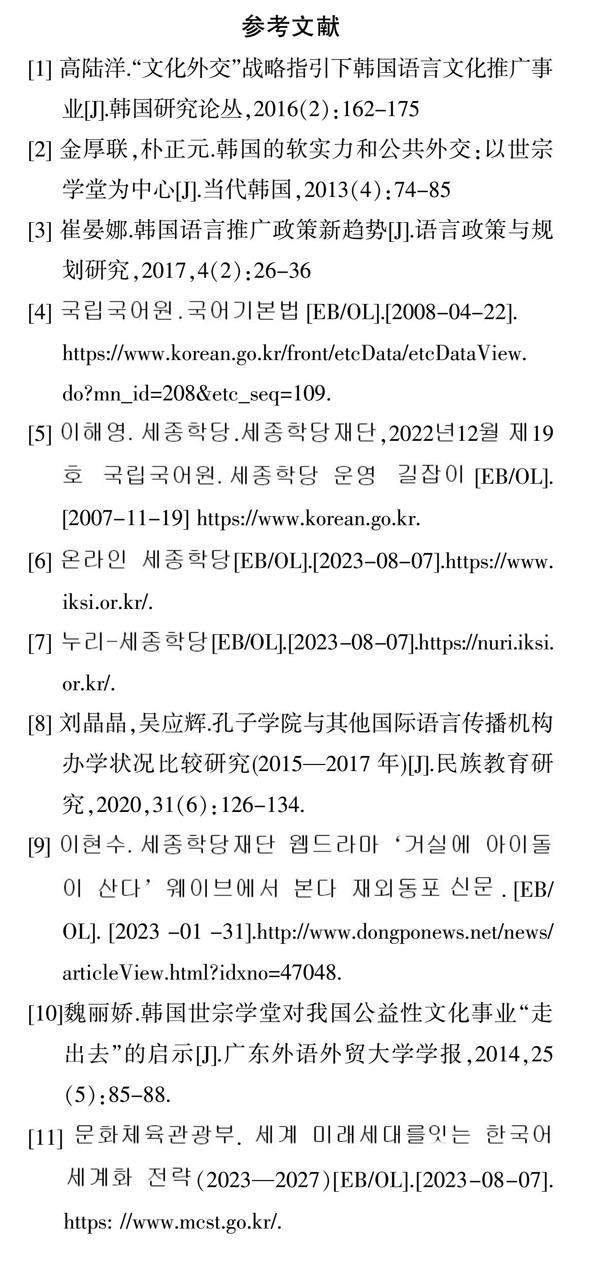 摘要:世宗学堂作为韩国政府对外推广韩国语教育·韩国文化的重要机构,在近10年间取得了飞速发展。韩国政府为推动韩国语世界化普及、推动世宗学堂事业,出台制定并多次修改《国语基本法》,于2012年设立世宗学堂财团,以负责统筹管理与支援海外韩国语教育和韩国文化推广事业。截至2023年6月,世宗学堂已扩展至全球85个国家248所,2022年全球累计学习者人数超过70万人。(剩余9594字)