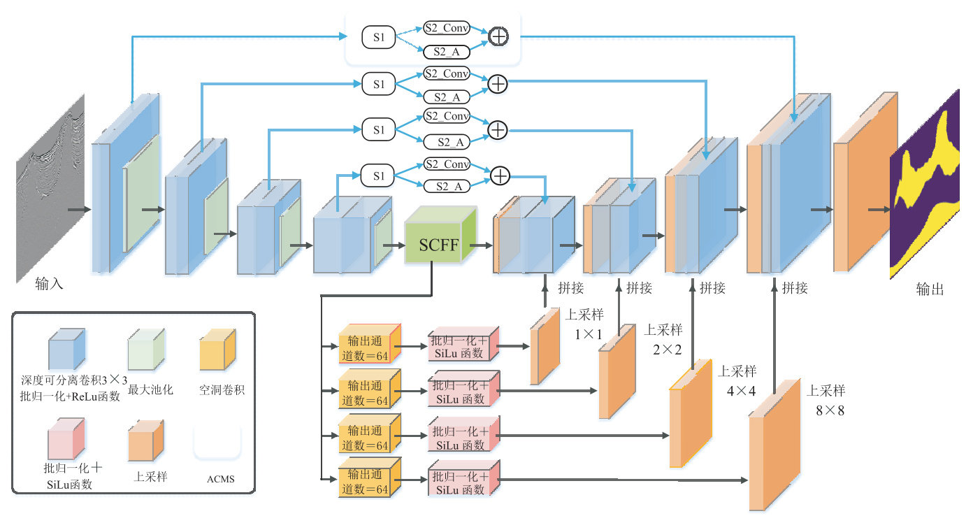 Abstract :Salt bodies are geological structures with good airtightness ,which are conducive to oil and gas sto⁃ rage. It is extremely necessary to achieve refined interpretation of salt bodies. However,unlike faults,salt bo⁃ dies have more complex characteristics and significant morphological differences,and thus conventional meth⁃ ods can easily lead to confusion and misjudgment. In addition,since data ⁃ driven salt body recognition models have poor generalization ability on actual datasets,there are still challenges in interpreting and visualizing salt bodies in seismic exploration. The paper regards salt body interpretation as a semantic segmentation problem for seismic images and proposes an intelligent salt body segmentation method based on the context fusion of transfer learning and mixed attention (multi ⁃ path structure mixed attention and transfer optimized net, MMTONet). At the same time,a salt body context feature fusion module is designed,and an improved atten⁃ tion convolution mixed skip connection mechanism is established to better compensate for the information loss caused by down⁃sampling ,thereby improving the pixel⁃level discrimination ability of the model for salt body boundaries and highamplitude noise. On this basis,a transfer learning adapter fine ⁃ tuning strategy is also de⁃ signed to improve the generalization ability of the model on actual data. The experimental results on seismic da⁃ tasets show that MMTONet outperforms mainstream semantic segmentation methods in improving segmenta⁃ tion accuracy and reducing computational and parameter complexity.
