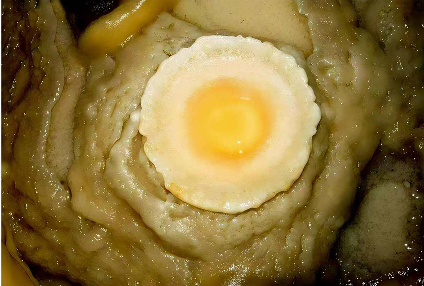 在贵州德江县五彩洋山河的雉仙洞中,“荷包蛋”钟乳石无疑是大自然馈赠的极致地质奇观。这颗直径约15厘米,中心金黄色部分与外围乳白色结构酷似荷包蛋形态的钟乳石,其成因蕴含着喀斯特溶洞地质演化的复杂密码,背后是亿万年时光雕琢与多重地质作用交织的结果。