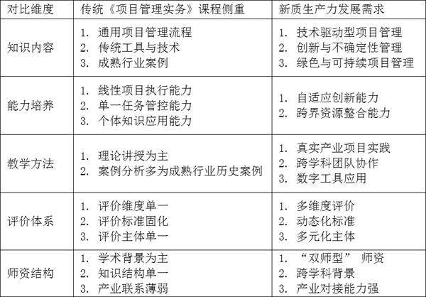 摘 要:在“新质生产力”成为国家发展战略核心导向的背景下,商科教育面临从知识传授向能力建构与价值引领转型的迫切任务。本文以《项目管理实务》课程为例,探讨如何在新质生产力导向下重构商科课程内容,旨在为构建更具活力与实效性的课程融合范式提供一些探索路径。
