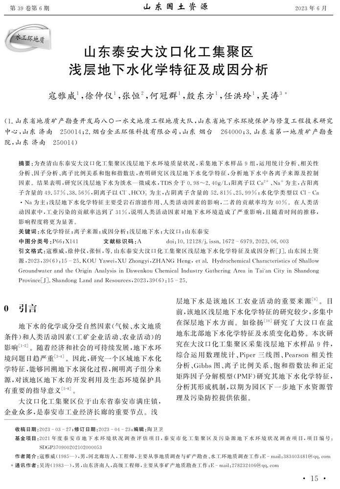 摘要:为查清山东泰安大汶口化工集聚区浅层地下水环境质量状况,采集地下水样品9组,运用统计分析、相关性分析、因子分析、离子比例关系和饱和指数法,查明研究区浅层地下水化学特征,分析地下水中各离子来源及控制因素。结果表明,研究区浅层地下水为淡水—微咸水,TDS介于0.98~2.40g/L;阳离子以Ca2+、Na+为主,占阳离子含量的49.57%、38.56%,阴离子以Cl-、HCO-3为主,占阴离子含量的52.81%、25.99%;水化学类型以ClCa·Na为主;浅层地下水化学特征主要受岩石溶滤作用、人类活动因素的影响,二者的贡献率均为40%。(剩余8858字)