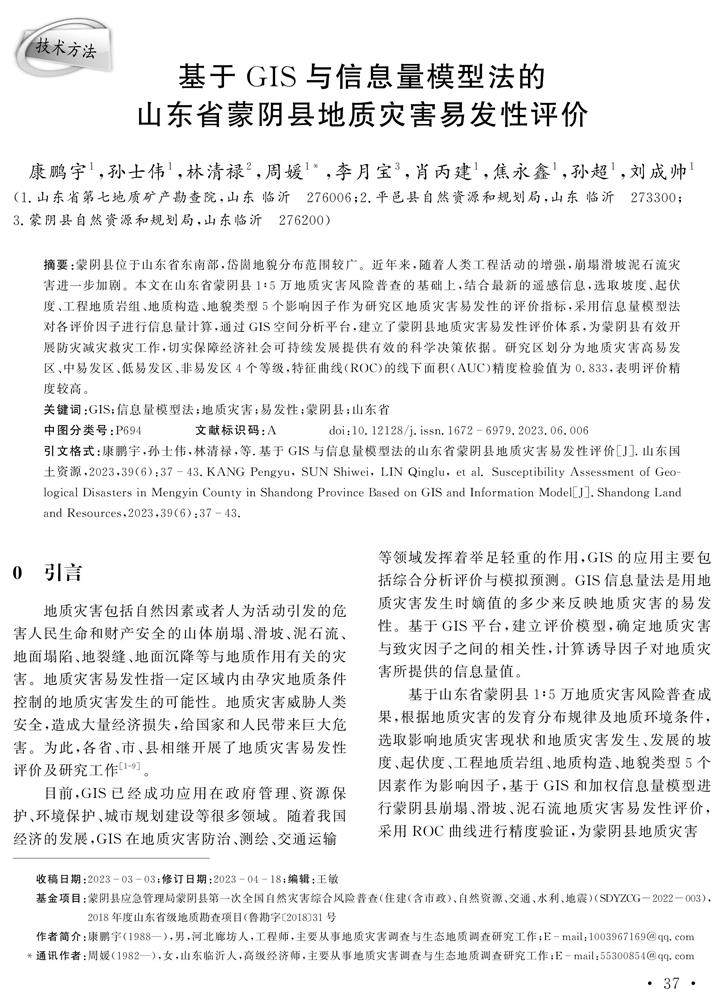 基于GIS与信息量模型法的山东省蒙阴县地质灾害易发性评价