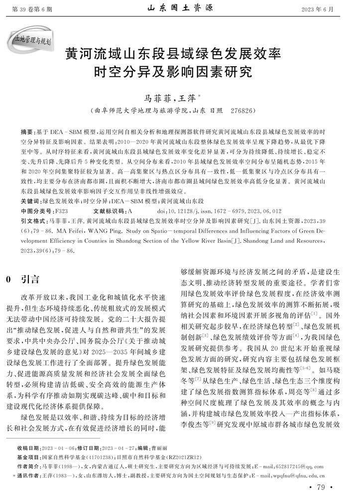 摘要:基于DEASBM模型,运用空间自相关分析和地理探测器软件研究黄河流域山东段县域绿色发展效率的时空分异特征及影响因素。结果表明:2010—2020年黄河流域山东段整体绿色发展效率呈现下降趋势,从最优下降至中等。从时序特征来看,黄河流域山东段县域绿色发展效率变化差异显著,可分为持续降低、持续增长、稳定不变、先升后降、先降后升5种变化类型。(剩余9096字)