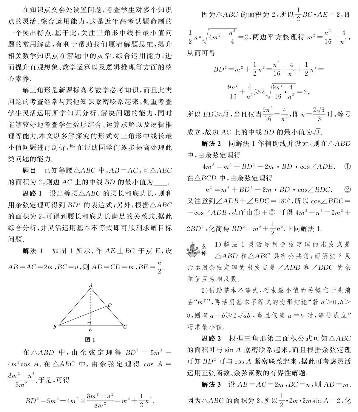 在知识点交会处设置问题,考查学生对多个知识点的灵活、综合运用能力,这是近年高考试题命制的一个突出特点.基于此,关注三角形中线长最小值问题的常(剩余70字)