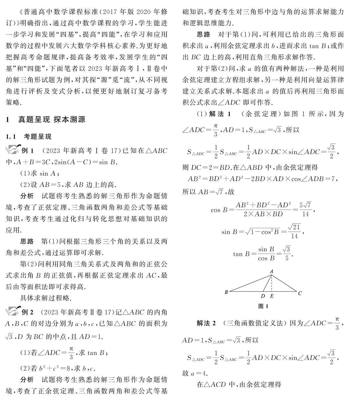 «普通高中数学课程标准(2017年版2020年修订)»明确指出,通过高中数学课程的学习,学生能进一步学习和发展“四基”,提高“四能”,在学习和应用数学的过程中发展六大数学学科核心素养.为更好地把握高考命题规律,提高备考效率,发展学生的“四基”和“四能”,下面笔者以2023年新高考Ⅰ,Ⅱ卷中的解三角形(剩余45字)