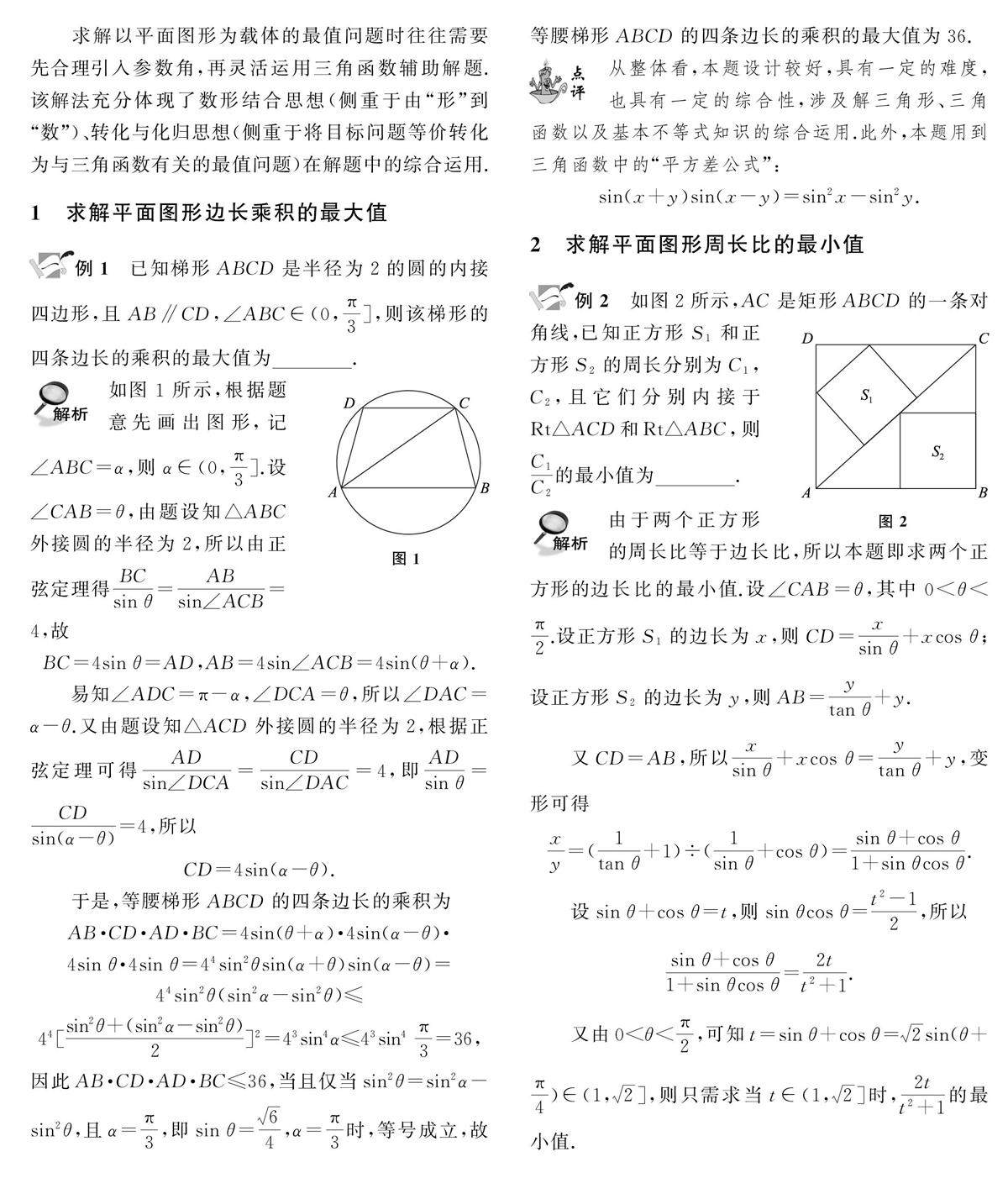 求解以平面图形为载体的最值问题时往往需要先合理引入参数角,再灵活运用三角函数辅助解题.该解法充分体现了数形结合思想((剩余57字)