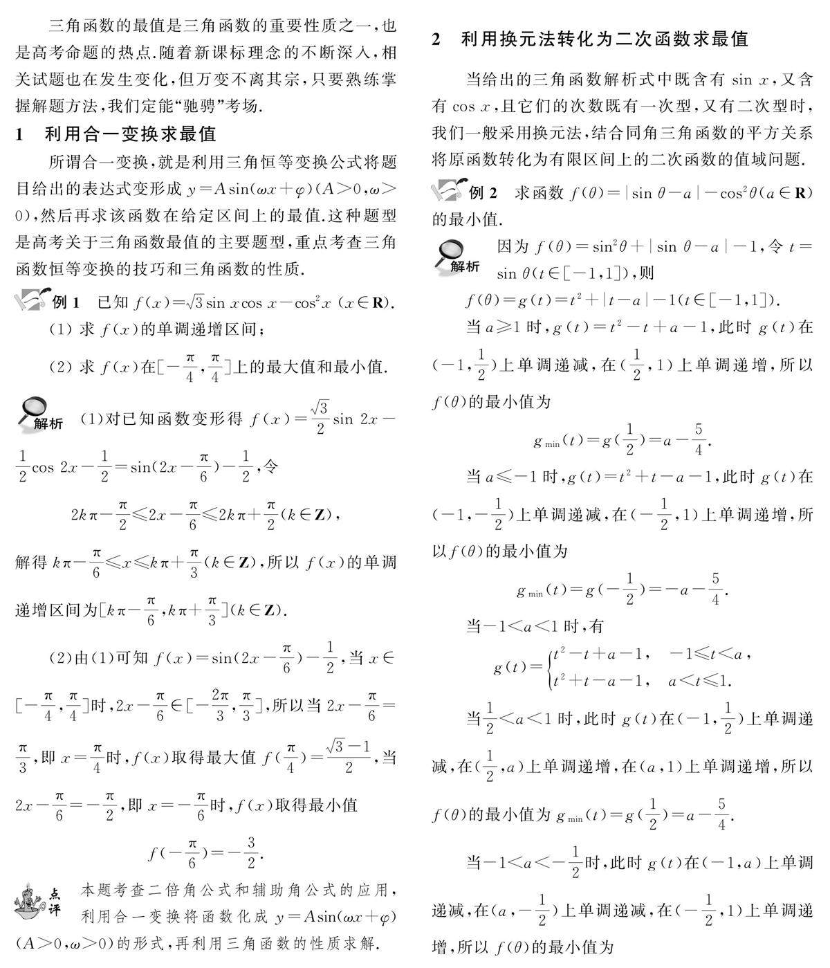 三角函数的最值是三角函数的重要性质之一,也是高考命题的热点.随着新课标理念的不断深入(剩余42字)