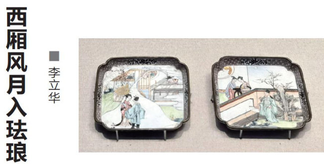 民国铜胎画珐琅《西厢记》盘,河北博物院藏,两盘均为方形,倭角。盘内壁满绘粉色小朵花卉,四壁中心椭圆形开光绘卷草纹,内地开光绘《西厢记》戏曲故事。盘外壁及底施白釉,四壁绘蓝色龙纹,盘底以淡粉、淡绿、淡蓝等色绘蝙蝠寿桃纹饰。