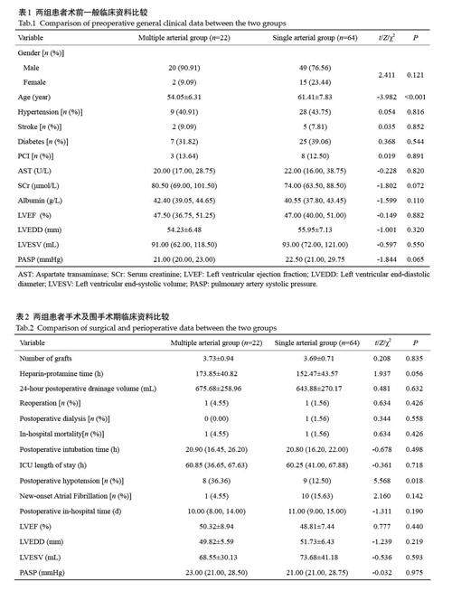 摘要:目的 比较多支动脉桥和单支动脉桥非体外循环下冠状动脉旁路移植术(OPCABG)在左心功能降低患者中的围手术期及近中期结果。方法 选取从2018年1月~2021年12月在郑州大学第一附属医院单治疗组行非体外循环冠状动脉旁路移植术且左室射血分数小于50%的患者86 例,其中行多支动脉桥OPCABG 22 例(多支动脉桥组),行单支动脉桥OPCABG 64 例(单支动脉桥组)。(剩余10733字)
