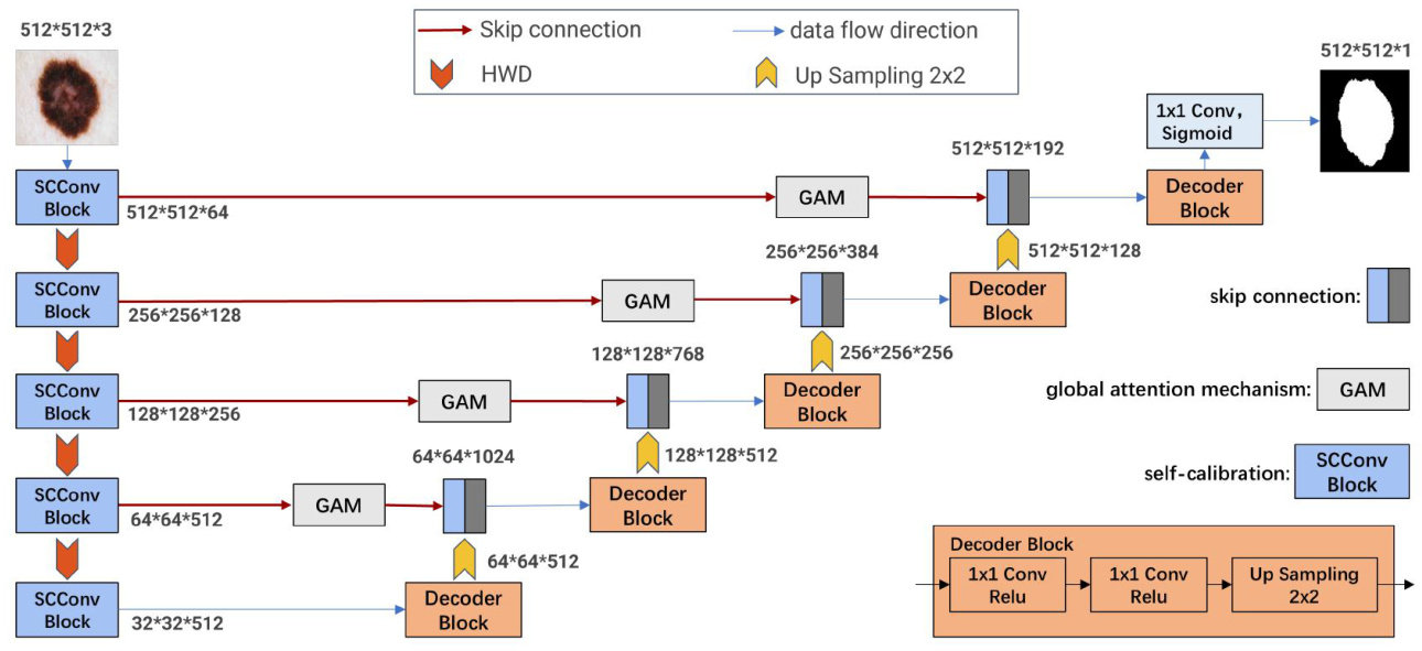Keywords:imagesegmentation;globalattentionmechanism;melanoma;UNet;self-calibratedconvolution;Haarwavelet downsampling; SG-UNet