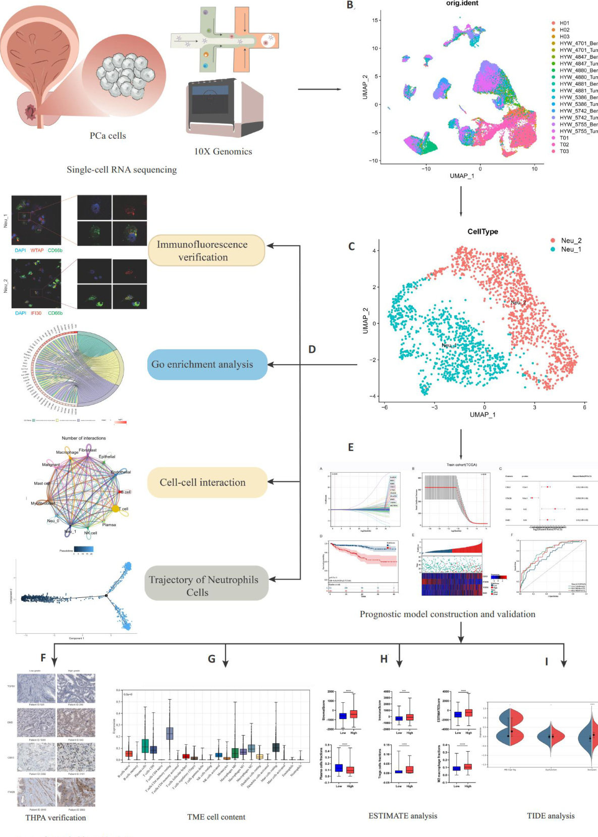 Abstract:Objective Toidentify immunosuppressive neutrohil subsets inpatients with prostatecancer (PCa)andconstructa riskpredictionmodelforprognosisandimmunotherapyresponseof thepatientsbasedonthese neutrophilsubsets.Methods Single-cellandtranscriptomedatafromPCapatientswerecollectedfromtheGeneExpressionOmnibus(GEO)andThe CancerGenome Atlas (TCGA).Neutrophil subsetsinPCa were identified through unsupervisedclustering,andtheir biologicalfunctinsandeffectsonimmuneegulationwereaalyedbyfunctionaleichment,cellinteractionndped timeseriesanalyses.Lasso-Coxregresion wasutilizedtoconstructaprognosticriskmodelbasedontheimmunosuppressive neutrophil subsets,and survivalanalysisandROCcurve analysis were used tocomparethe prognosisof PCa patients with highand lowrisksstratified using this model.Therelationshipofthe prognosticriskmodel withPCaimmune infiltrationand immune response was evaluated using CIBERSORT and TIDE scores. Results PCa tisues showed a significantly greater proportion of infiltrating neutrophils than the adjacent normal tissues (P<0.05) . PCa-associated neutrophils could be clustered intotwoindependentcellsubsets:Neu_1andNeu_2.Neu_2cels exhibitedhighlyenrichedimmunoregulatoryfunctiosand werehighlydereiatedndure,itregatediouppessieoinsschsF2d. BasedonthegeneticcharacteristicsofNeu_2cellsubsets,theprognosticriskmodelwasconstructed.Thepatientsinthehig risk group identified by themodel hada shorter biochemical recurrence time (P<0.05) andahigherproportionof Tregsand M2-TAMs cell infiltration (P<0.05) witha higher risk of immune rejection and poorer immune response scores. Conclusion PCa-associatedneutrophilsarehighlyheterogeneous.Theprognosticriskmodelconstructedbasedontheimmunosuppressive neutrophilNeu_2subsetcaneffctivelypredictboththesurvivaloutcomesandimmuneresponseofPCapatients. Keywords: single-cellRNA sequencing; transcriptomics; prostate cancer; neutrophils; tumor microenvironment